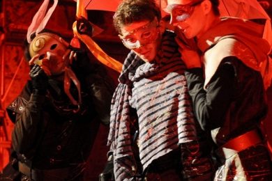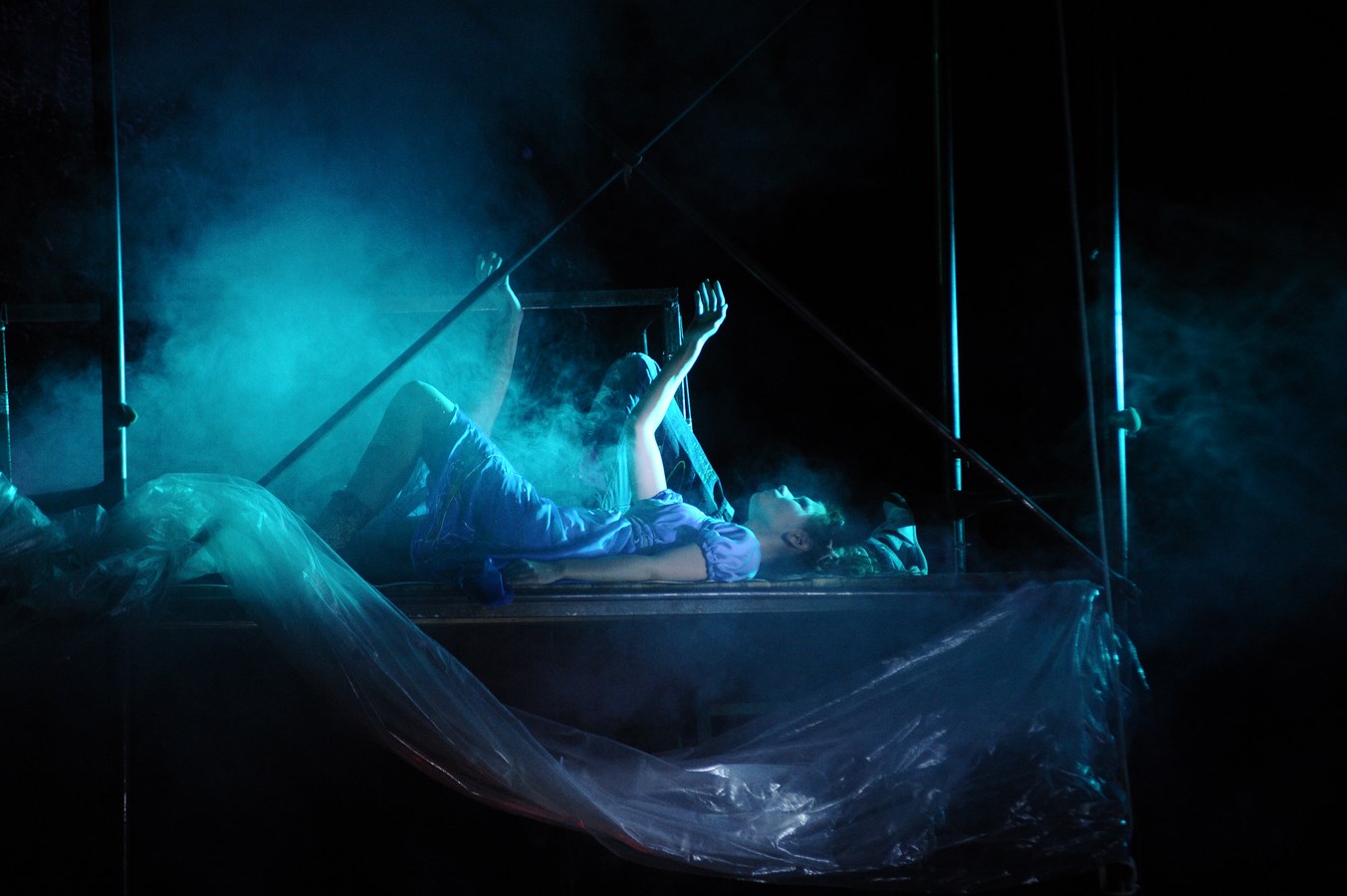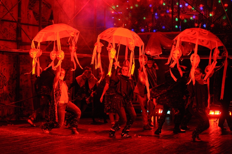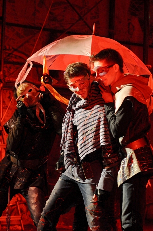 Еще более усиливает ирреальность происходящего дымовая завеса, то и дело скрывающая от зрителей лица героев и царящий на сцене полумрак. Действие в шекспировской Вероне освещается только специальными прожекторами и фонарями, и лишь в первых и последних сценах, изображающих современную нам действительность, свет полностью включен.