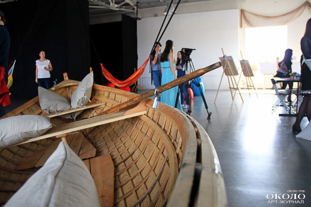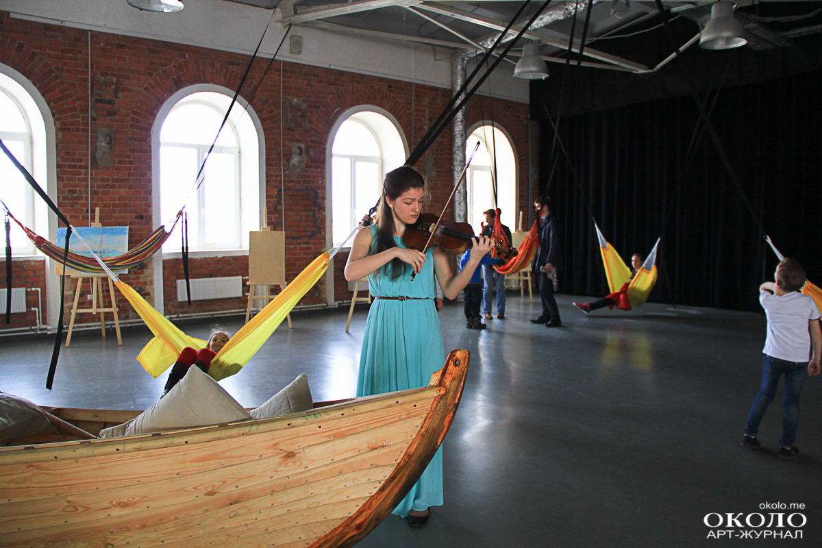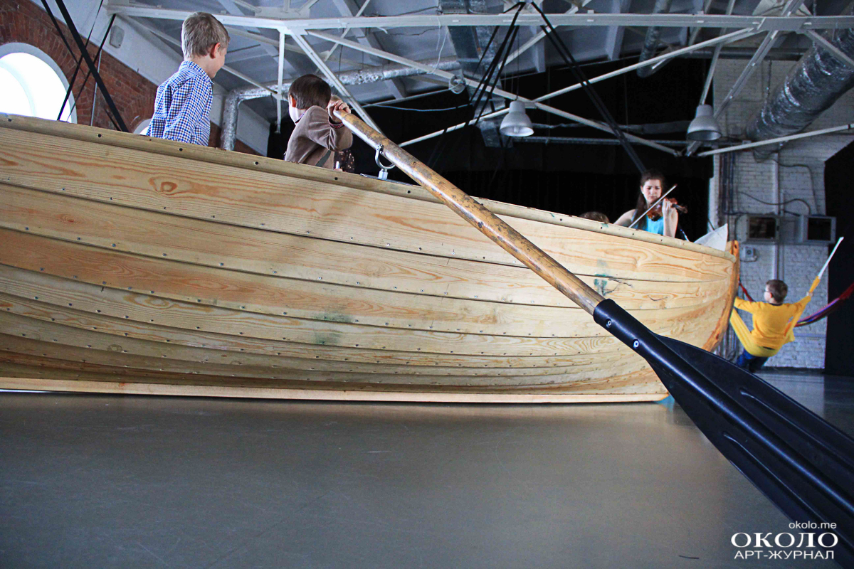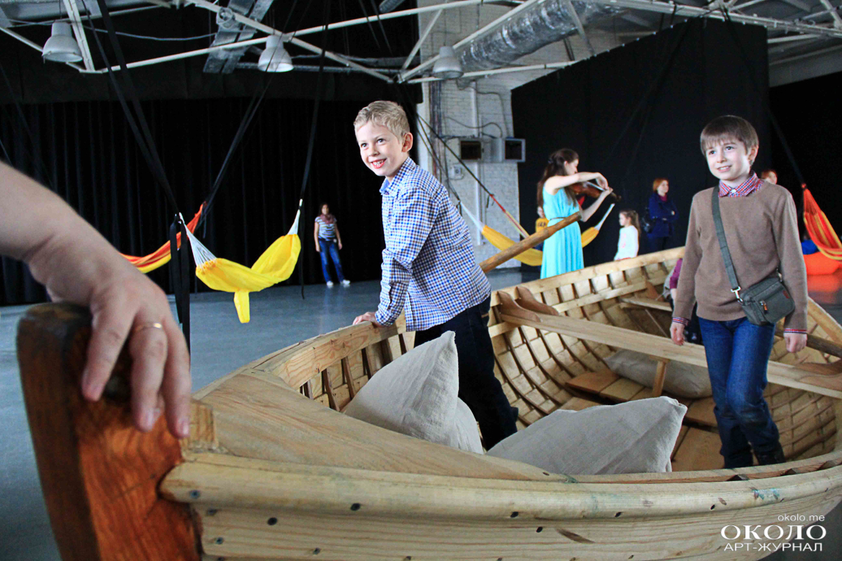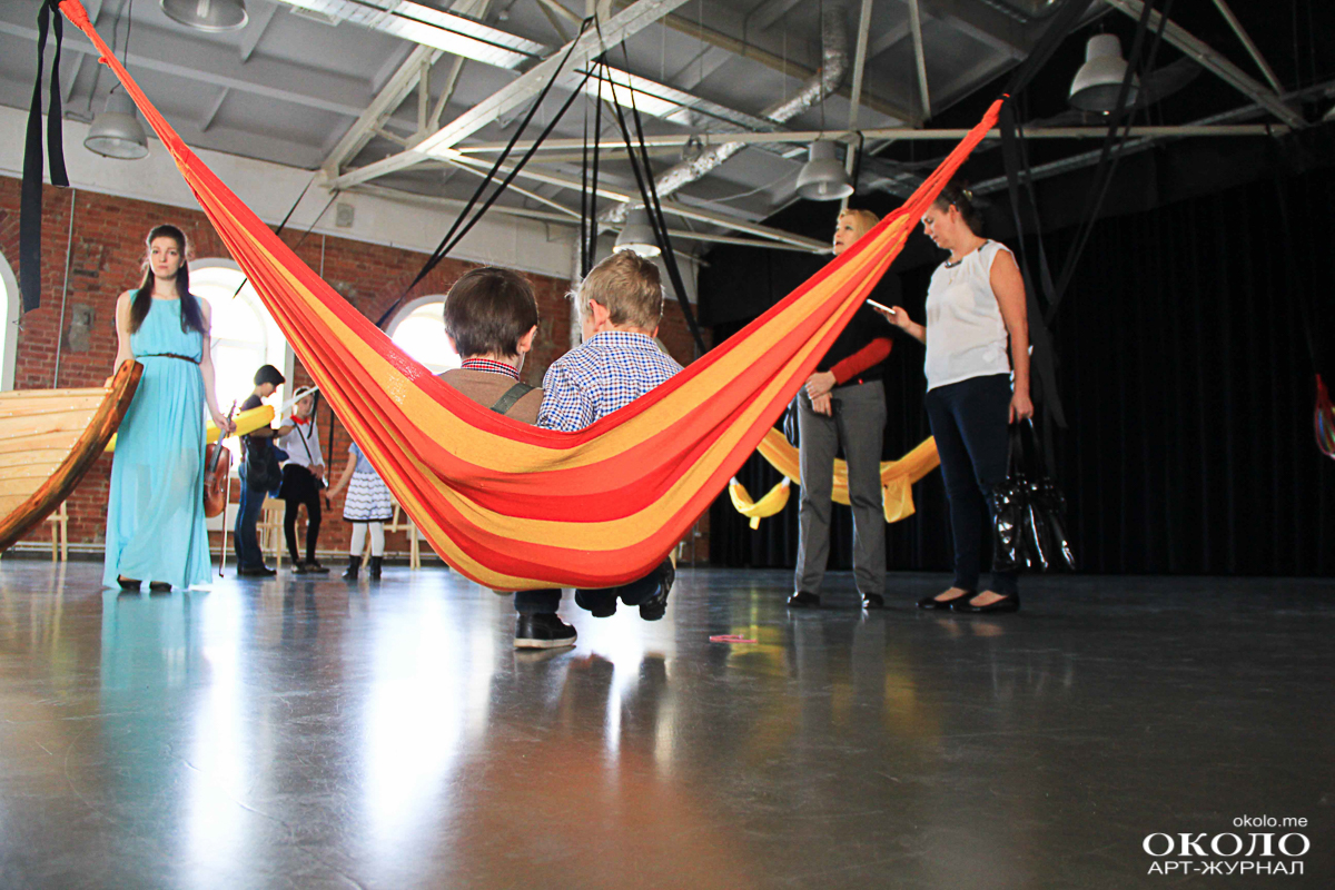 На пятом этаже в пространстве «ТКАЧИ» звучит классическая музыка. В импровизированной комнате за чёрной ширмой сёрфер циклично покоряет одну и ту же волну. Солнце освещает снующую по залу детвору. Малыши раскачивают друг друга в гамаках. Парочка забралась в стоящую в центре зала лодку, переваливаясь от одного борта к другому.