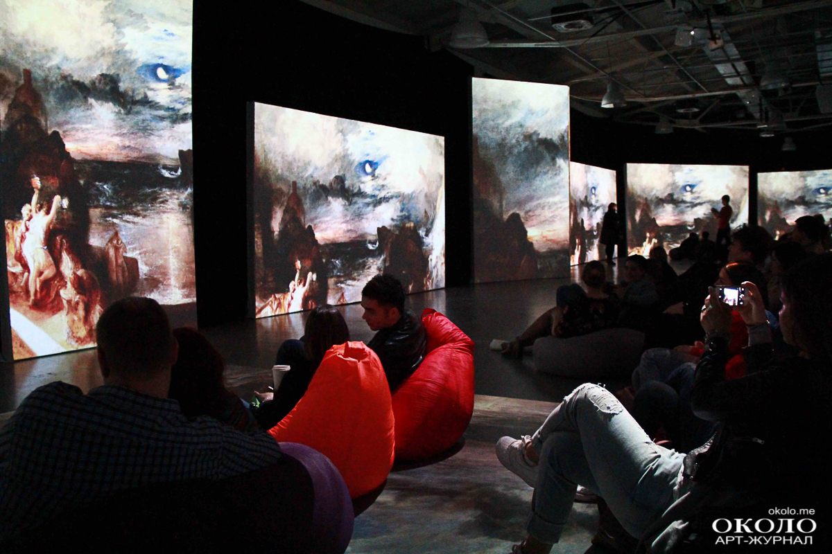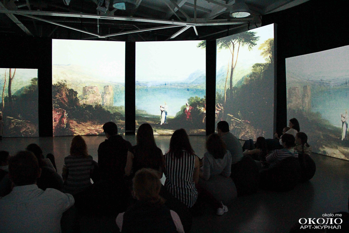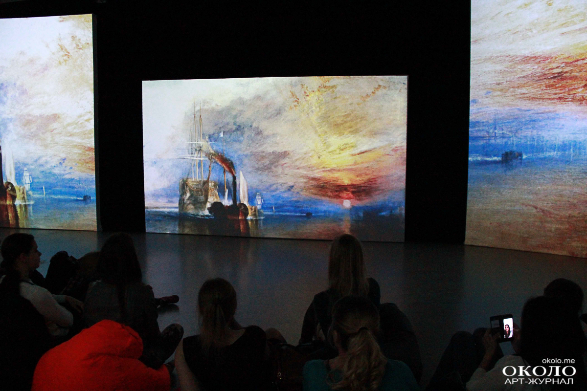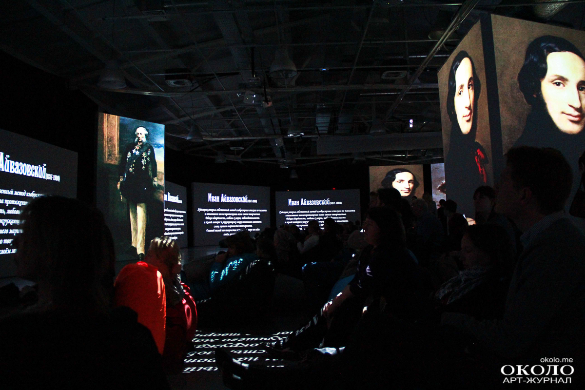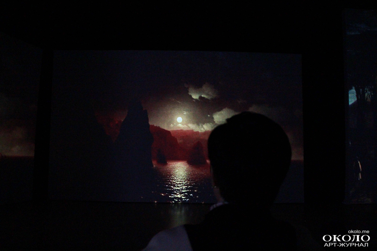 За большой чёрной ширмой скрывается самая главная интрига выставки – те самые «живые полотна». Из светлого помещения зритель попадает в тёмное пространство с бесформенными креслами. Около пятидесяти проекторов одновременно передают изображение на двадцать полотен, пол и потолок. Изображения спокойного и тихого моря сменяются бушующей бурей, кружащей корабли. Музыка в унисон изображениям то тихо и размеренно растекается по залу, то громыхает.