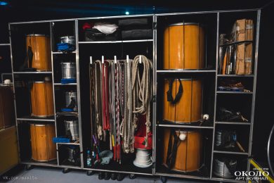 Путешествуя дальше по закулисному миру, обнаруживаешь то сакральное место, где создается магия шоу: по полу разложены маты и коврики – здесь артисты тренируются. Тут же подвешены тросы и страховка, воздушные номера до прогона на сцене репетируют тоже над матами. Кто-то лежит на них, подперев голову рукой, и о чем-то болтает, а кто-то еще упорно тренируется. По периметру стоят тренажеры, привезенные с собой, недалеко виднеются комнаты для переодевания, а также зеркала, рядом с которыми артисты наносят грим. Возле гримерок расположились десятки шляп и париков – неизменных атрибутов шоу Quidam.