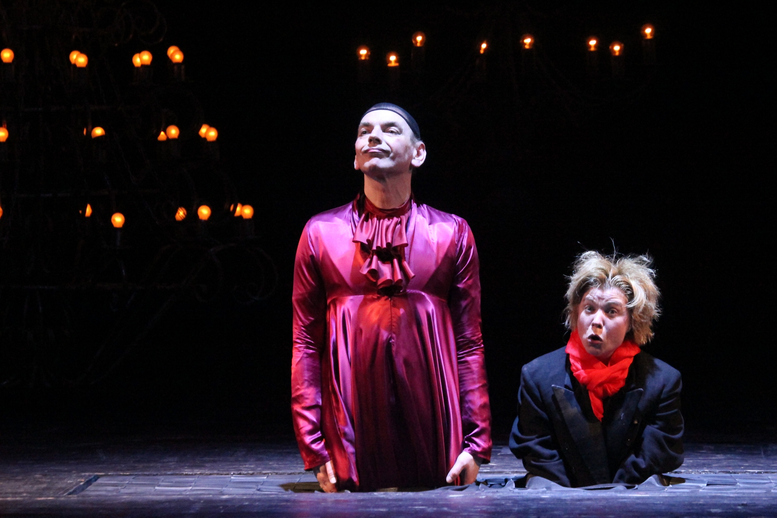 Сцена прекрасно задействована во всех ракурсах. Герои могут появляться буквально из ниоткуда, ведь в середине сцены находиться таинственное углубление, позволяющее скрывать предметы, людей и даже фрагменты декораций. Таким образом, каждое появление Оберона, приятно шокирует зрителя.