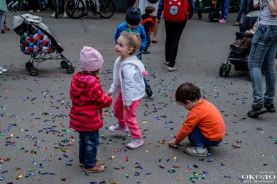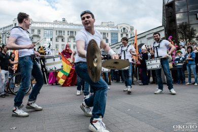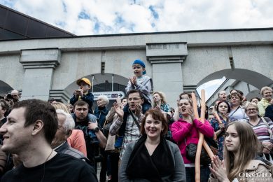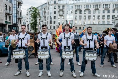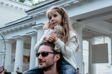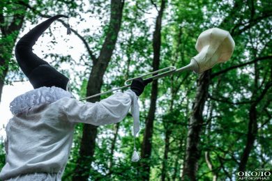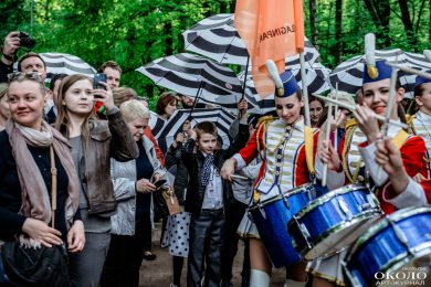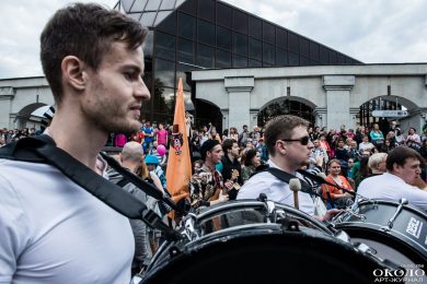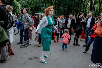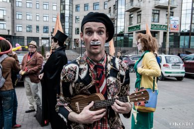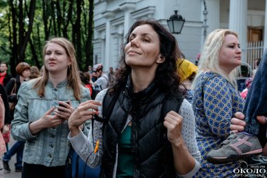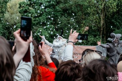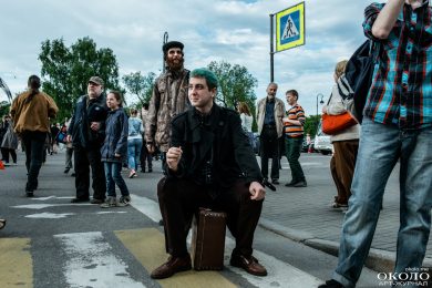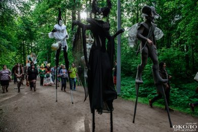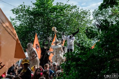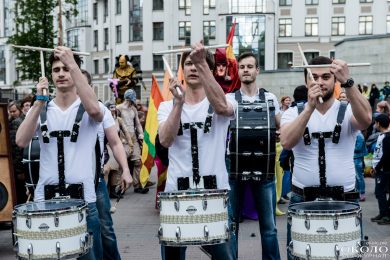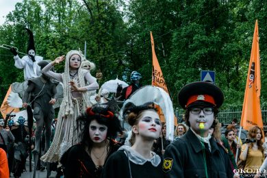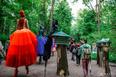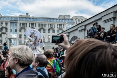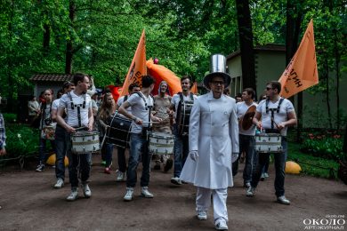 29 мая возле метро Крестовский остров царил аншлаг. В 17.30 здесь собрались все коллективы проекта, чтобы совершить театрализованное шествие от метро до площади у Конюшенного корпуса на Елагином острове. Фестиваль уже успел полюбиться питерской публике, все с нетерпением ждали начала представления, фотографируясь с различными персонажами. Кого здесь только не было! Страшные Аватары, прыгающие на огромных ходулях, клоуны, бьющие ради забавы игрушечным молотком зрителей по лбу, сказочные принцессы в белоснежных одеяниях, зажигательные барабанщики, юные артисты из детских театральных студий… «Ты ушки давно чистил? Смотри, у тебя в ухе лимон!» – сказал маленькому мальчику клоун, продемонстрировав ловкость рук. И вот шумная компания, состоящая из бродячих уличных артистов, мальчишек, девчонок, их родителей, молодежи и остальных любителей театра, прошла торжественным парадом до ЦПКиО им. С.М. Кирова, собирая по дороге все больше людей.