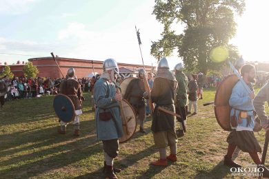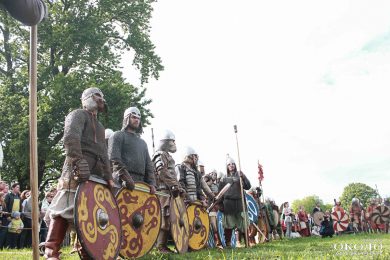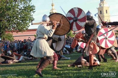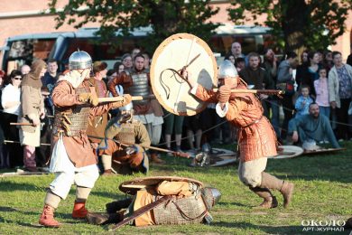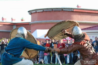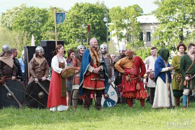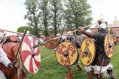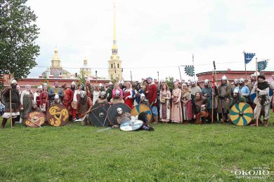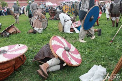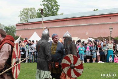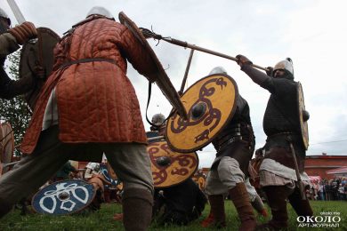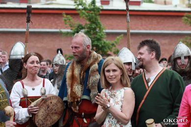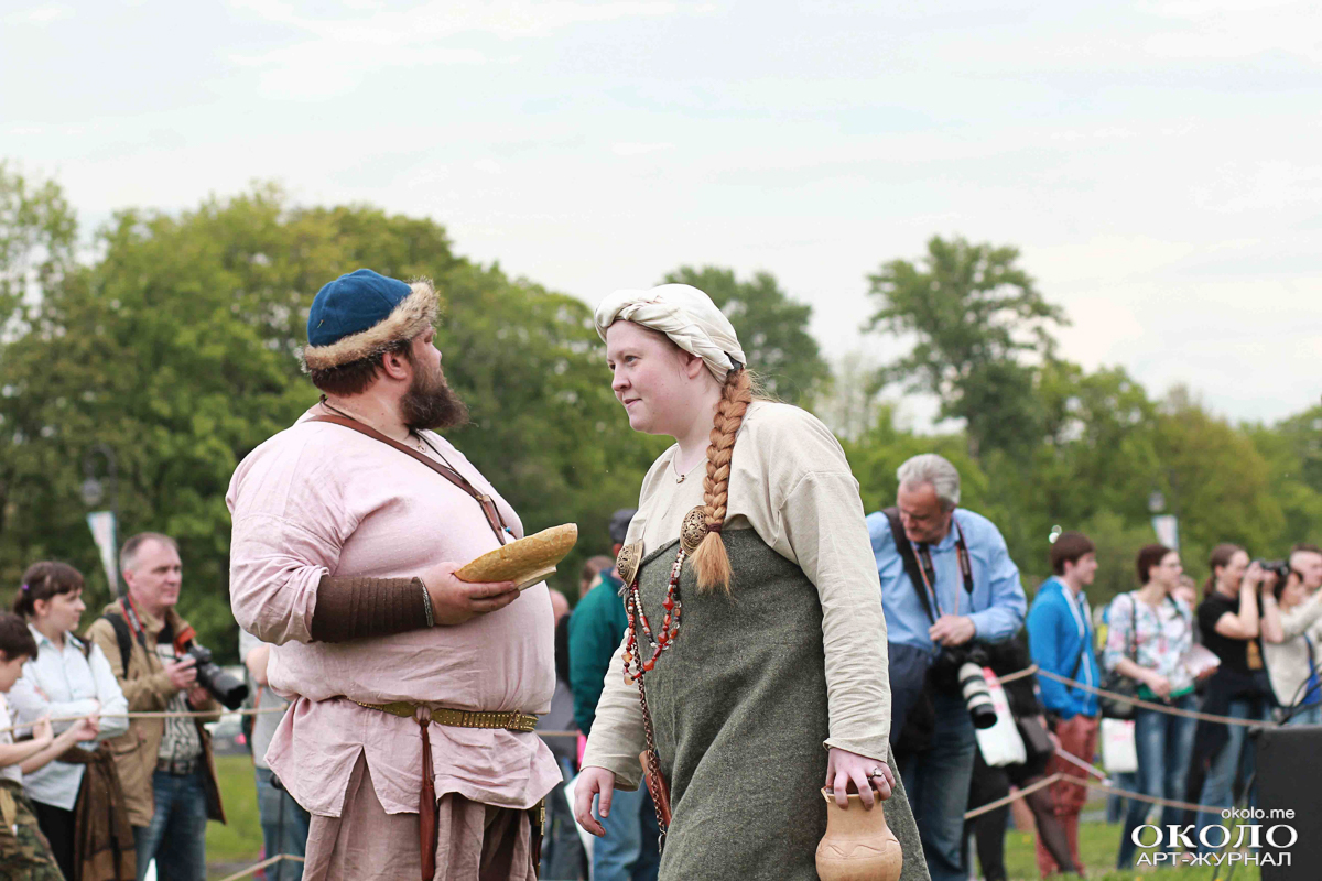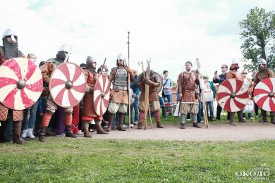 Конунга, древнескандинавского правителя из норвежского музея Лофотр, встретили славянские воины. Реконструкторы из Петербурга, Москвы и других городов России собрались, чтобы блеснуть своими доспехами, оружием и военным ремеслом. У каждого отряда воинов свой предводитель, который командует и следит за дисциплиной.