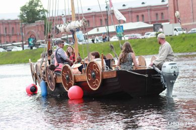 На петрозаводском образце драккара стоит мотор, но корабль ходит и под парусом. Есть на нём и вёсла, но они не несут практической пользы, а нужны чтобы просто погрести, как рассказывает владелец лодки. По Кронверкскому проливу всех желающих катали бесплатно 29-31 мая, а вообще у капитана драккара семейный бизнес в Карелии – они устраивают водные экскурсии по Ладожскому озеру.