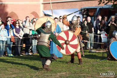 Воины в доспехах и с оружием, при бородах и амулетах расходятся по разные стороны ристалища. По цветам щитов и по гербам на них можно определить принадлежность воина к тому или иному клубу реконструкторов. Это трёхглавые драконы, птицы, простые красно-белые спирали или бело-синие четверти, напоминающие знак BMW. В основном, воины были одеты в доспехи, вендельские шлемы, кольчуги, пластинчатые и кожаные рубахи. Были и особенно отчаянные: в тканевой одежде, уповающие лишь на простой шлем и щит. В битве важную роль играют кисти – именно они держат оружие и щит, поэтому воины используют толстые рукавицы. Если ниже колена ноги воинов скрыты толстым слоем ткани, а руки выше локтя покрывают доспехи, то колени и руки от кисти до локтя – самые незащищённые части тела.