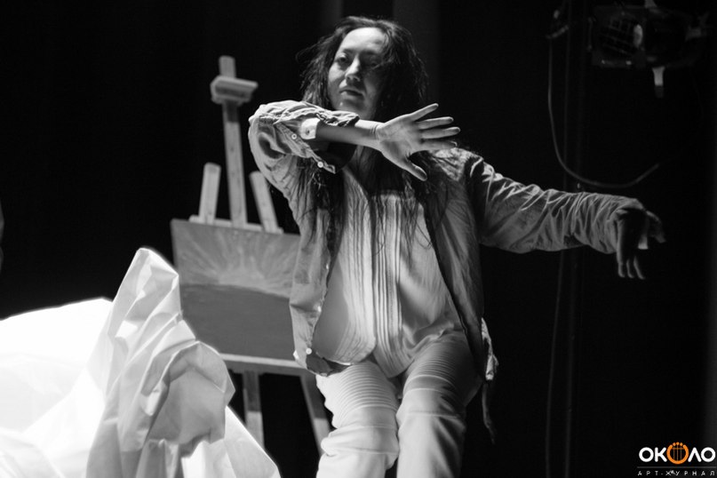 Александр Кискачи на флейте играет «Медитацию Ryohei Hirose»: героями сценического пространства становятся белые на черном следы и свет восходящего солнца.