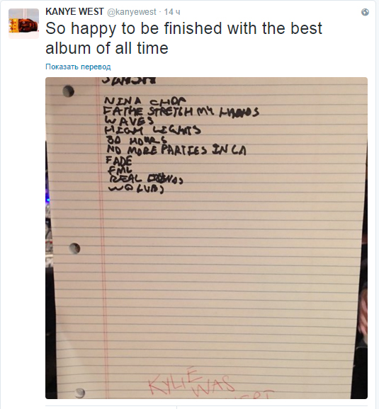 Поклонники американского рэпера в восторге от новостей. В твиттере Канье Уэст написал, что работа над альбомом завершена. Также он выложил список песен, написанный от руки. Правда, многие сочли его заявление совсем нескромным. «Я счастлив, что окончил работу над лучшим альбомом всех времен!» — написал музыкант.