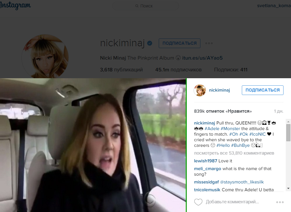 В интернете тиражируется видео, где Адель едет в автомобиле и в паре с шофером напевает песни. Певица исполнила как свои композиции(«Hello«, «Someone like you«), так и произведения иных популярных исполнителей(Spice girls»Wannabe» и Nicki Minaj «Monster«). Она просто покорила своим пением Минаж и заслужила от нее похвалы в инстаграме. Поп—дива назвала ее «Королевой«.