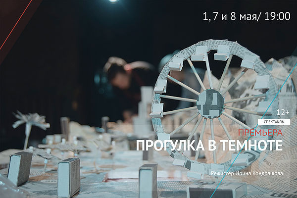 Спектакль «Прогулка в темноте» идеально подходит для того, чтобы выразить концепцию культурного центра на Хитровке: это история души, в которой отражается все происходящее с человеком в городе. Автора идеи (режиссера Ирину Кондрашову) вдохновили картины Марка Шагала, где герои изображены в полете над бытием, как духовные сущности двух влюбленных: вне условностей они смогли преодолеть рамки телесного и соединиться. Именно это и происходит с абстрактным героем, чья безымянная душа парит над нарративом жизни. Его путь делится на два города (две эпохи): провинциальная глубинка (детство, отрочество) и мегаполис (юность, зрелость, старость). Антитеза между двумя объектами прослеживается в звуковой подборке, которая сопутствует мысли автора и поясняет ее. Обрывки фраз, звук сирены, сигнал будильника, звон велосипедного гудка – все это раздается во внешнем мире, как знакомый каждому саундтрек в фильме, тоже не новом. Зритель видит лишь изменяющееся состояние внутреннего человека, понимая причинно-следственную связь на уровне настроения, ассоциаций и интуиции. Например, когда новоявленный городской житель осваивает ночные развлечения, его духовная сущность на глазах зрителя измазывается в краске, вязкой, как трясина, в которую ее затягивает гедонистические попытки человека забыться и пристроить себя хотя бы на время.