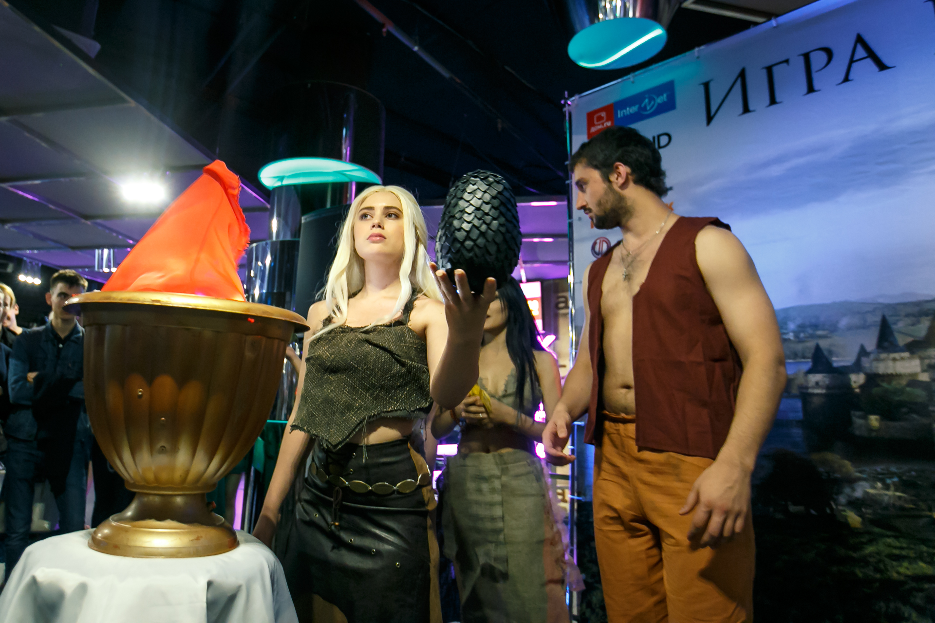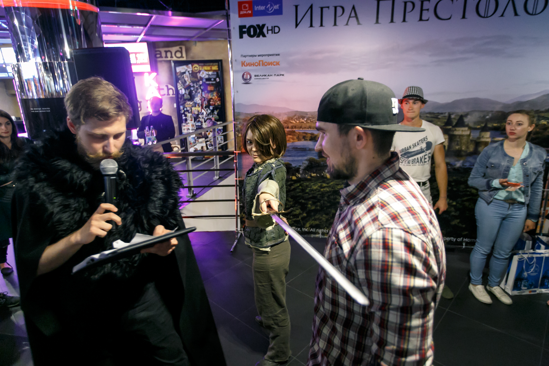Особого упоминания заслуживает ведущий мероприятия — Денис Феоктистов разогрел публику викториной и шутками, создал очень доброжелательную атмосферу. В помощь ему пришли косплееры, зачитывая известные монологи из «Игры престолов» и попутно задавая вопросы публике, опять же награждали призами. На подарки организаторы не поскупились, их было достаточно, чтобы дать шанс выиграть почти каждому желающему. Многие счастливцы уходили в зал с кружками, футболками, постерами и стикерами, на которых изображены персонажи «Игры престолов». На такой позитивной волне, гостей не смутили технические неполадки. Томительное ожидание затянувшегося старта зрители сдобрили морем шуток на сериальную тему. Вот что значит – настоящие фанаты. Даже если в какие-то моменты картинка тормозила, эта доля секунды никого не волновала, все были погружены в серию.