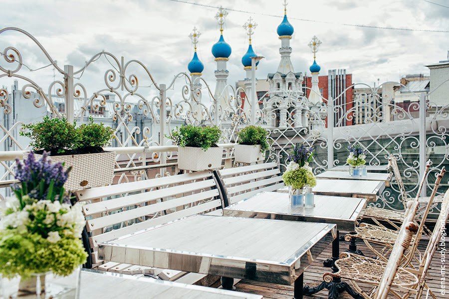 На первом этаже располагается мини-магазин, где вы можете приобрести сладости и забрать их домой в приятной упаковке. Дальше узкая светлая лестница, вдоль которой полки с необычными вещами, и вот вы уже в крохотном зале, заставленном столиками до отказа. Тут же барная стойка и, конечно, веранда — главная достопримечательность ресторана. Нежный интерьер в стиле Прованс с добавлением металлического хай-тека — весьма необычное сочетание, но оно не создаёт неприятного впечатления об этом месте. Белые качели, металлические заборчики, деревянные лавочки — всё создаёт ощущение воздушности, лёгкости. Да ещё и возвышающиеся маковки церквушки радуют глаз.