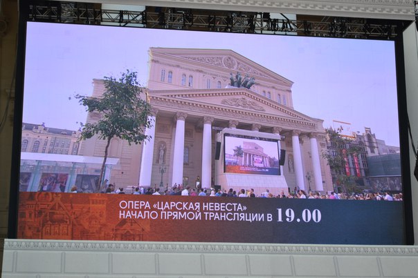1 июля Большой театр пригласил всех любителей искусства насладиться постановкой оперы Римского-Корсакова «Царская невеста». Для этого на фасаде Большого со стороны Театральной площади установили огромный экран, на котором в режиме реального времени транслировалось то, что происходило на сцене.