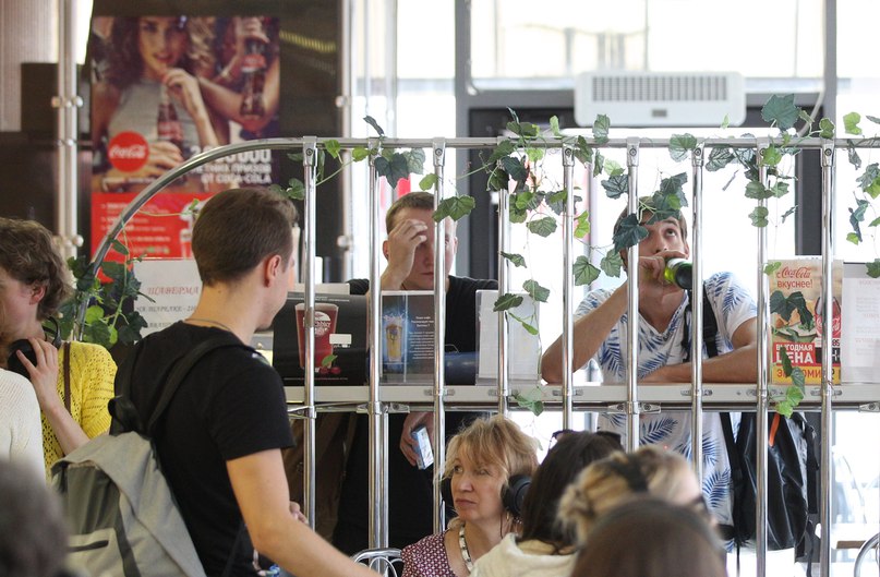 Актеры точно придерживаются текста и, насколько это возможно, антуража – пьют вокзальный кофе, заказывают пиво в кафе, выходят курить. Молчаливый гид с красным флажком маршрутизирует зрителей, если надо переместиться между залами, однако, оказавшись в новой локации, каждый сам выбирает себе место для просмотра – перемещается по залу ожидания или садится на соседнее кресло от актера, смотрит на говорящих или в телефон, заказывает себе кофе или удаляется на почтительное расстояние, воспринимая звук в наушниках наподобие аудиокниги. Вокзал же — огромная живая декорация, в наушники пробивается звук объявлений об отправлении поездов, сигналы металлоискателей, шум толпы – такого не создаст никакой художник и звукорежиссер.