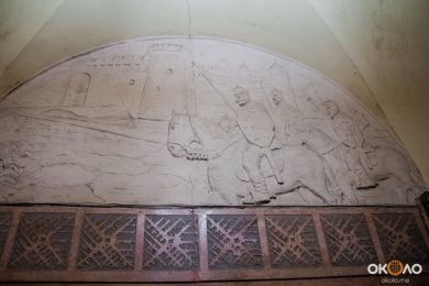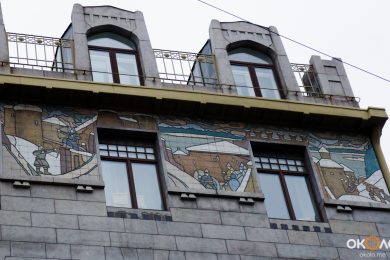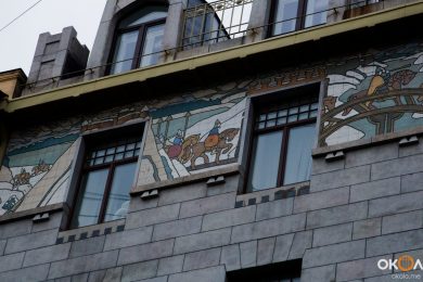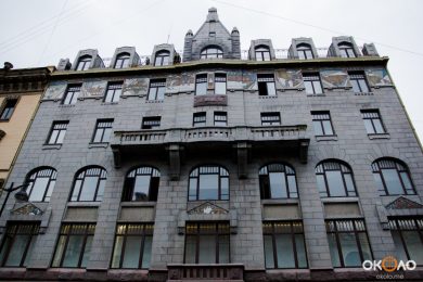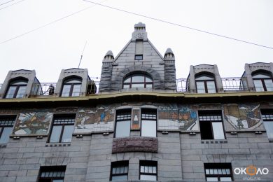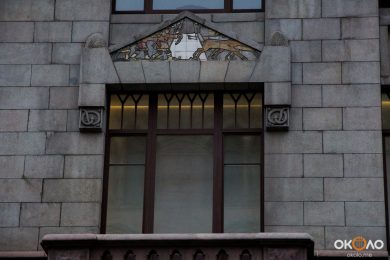Майолика — изделия из обожженной глины, покрытые непрозрачной глазурью и раскрашенные огнеупорными красками. Это может быть и домашняя утварь, и скульптурные изображения. Название таких изделий произошло от острова Майорки. Maiolica — имя острова, смягченное итальянским народным произношением. Откуда в 1115 году были впервые вывезены генуэзцами, как военная добыча в их борьбе с пиратами, испано-мавританские керамические сосуды и поливные плиты, послужившие для итальянских гончаров образцами для производства майолики. Именно майолика, созданная по картонам Николая Константиновича Рериха, украшает фасад здания РОСФОТО. Именно с изучения фасада РОСФОТО и ближайших зданий начинается наша экскурсия. Николай Рерих — русский художник, сценограф, философ-мистик, писатель, путешественник, археолог за время экскурсии упоминается неоднократно. Именно ему молва приписывает авторство большей части убранства здания, однако, это не совсем так.