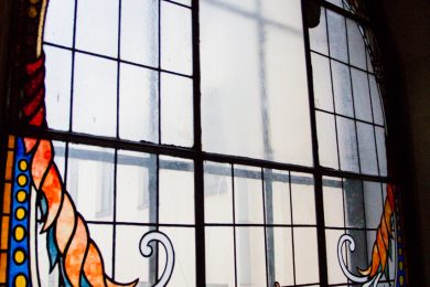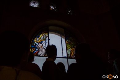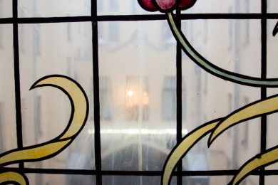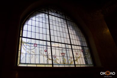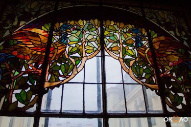Закончив осмотр двора, экскурсанты, наконец, попадают в дом № 35. Осмотр начинается с лестничной площадки верхнего этажа. Вернее, с витража, украшающего окно площадки. Возможно, вы сможете угадать, кто же изображен на нем? Наша группа не смогла.