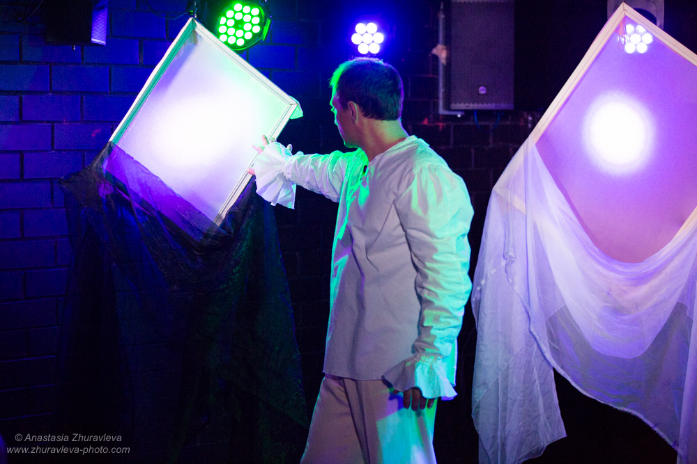 На это же направлены и игры с декорациями. Сценография — одна из самых больших удач спектакля. Четыре затянутых материей квадрата могут служить чем угодно — занавесом, театром теней, ширмой для смены образа, и даже знаменитым Нотр — Дам де Пари. Когда актеры погружают лица в натянутый пласт тонкой ткани, получаются жутковатые трехмерные изображения, напоминающие горгулий, химер и прочую архитектурную нечисть величественного собора.