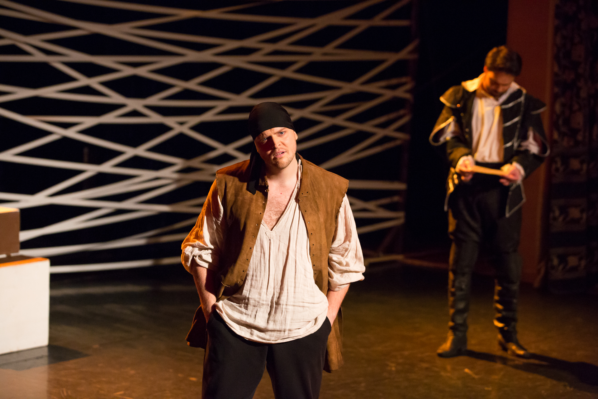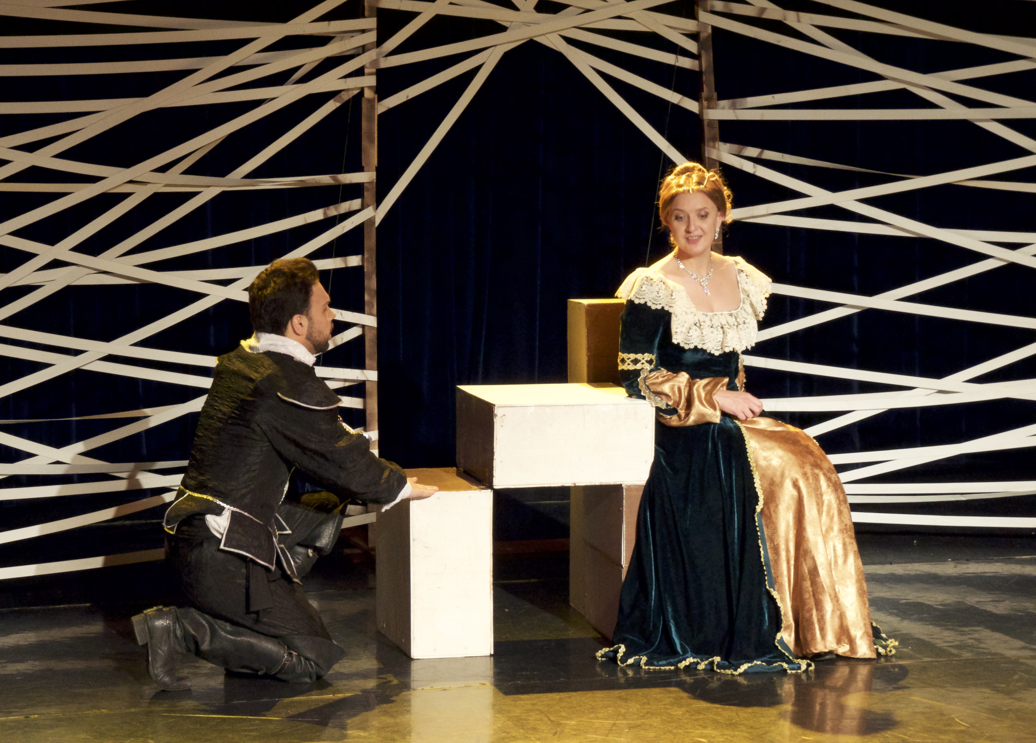 Первое, на чем действительно стоит заострить внимание — это декорации. Хочется отметить их даже не потому, что они оставались неизменными на протяжении всего спектакля, а потому что при всем своем минимализме они выполняли крайне обширный функционал, так что у зрителя даже не возникало ощущения нехватки чего-то более фундаментального. Решётка из эластичных лент и множество раскладывающихся кубов, которые служили героям стульями, столами, кроватями, ящиками — это всё, что было представлено нам в качестве декораций, но самым интересным является то, что среди них не было ничего указывающего на эпоху или страну, в которой происходит действие. Этот смелый и в то же время крайне разумный шаг предпринимали ещё в шекспировскую эпоху: трагедии великого драматурга настолько уникальны в своей обобщённости и настолько актуальны в своей содержательной особенности, что любая привязка ко времени стала бы просто кощунством по отношению к тем бессмертным темам, которые поднимал писатель в своих произведениях. Разве нельзя сказать то же самое о комедии Лопе де Вега? В своем литературном творении автор коснулся тех струн человеческой души, которые будут всегда звучать в унисон с одними и теми же настроениями, волнениями, эмоциями, потому что они настолько близки каждому человеку, настолько интимны и одновременно обобщены для всех, что будут оставаться понятными, пока в людях будет жива душа со всеми её страстями.