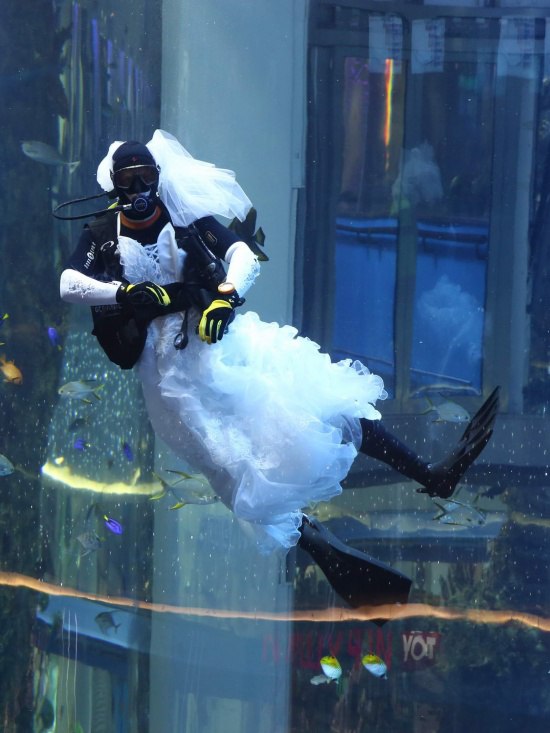 Самым необычным и интересным гостям показалось плавание невесты аквалангистки в свадебном наряде в большом аквариуме ТРЦ «Океания».