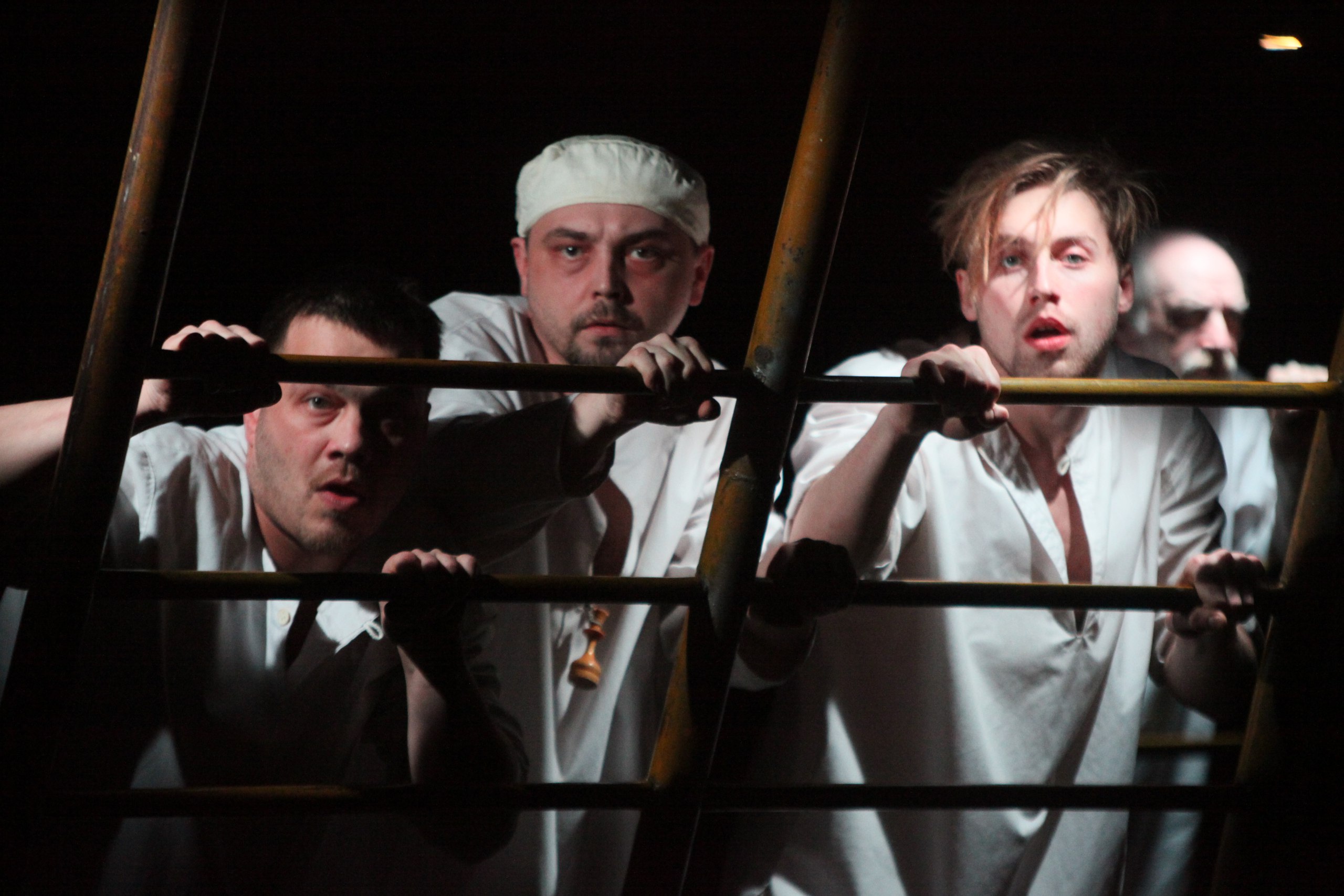 Недаром монолог Гуревича, который заканчивается горьким выводом, о том, что прежде, чем ломать Россию, ее надо бы просветить, вложен в спектакле в полупьяные уста комсорга Паши (Михаил Грищенко), представителя молодой советской интеллигенции. Юноша с ясным, немного удивленным взором, он, как ребенок радуется, когда узнает, что все — таки никого не убивал, потому что совершенно не помнит, за что он попал в больницу. Своих подлинных историй не знают или уже не помнят и прочие пациенты психушки. Они давно стали полудетьми, трогательными и наивными, жалкими, не особенно похожими на тронутых умом. Крохотная модель прозябающего в застое социалистического рая.