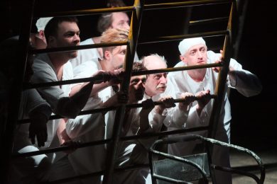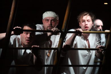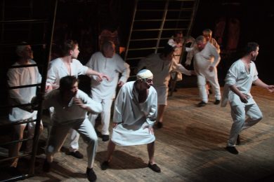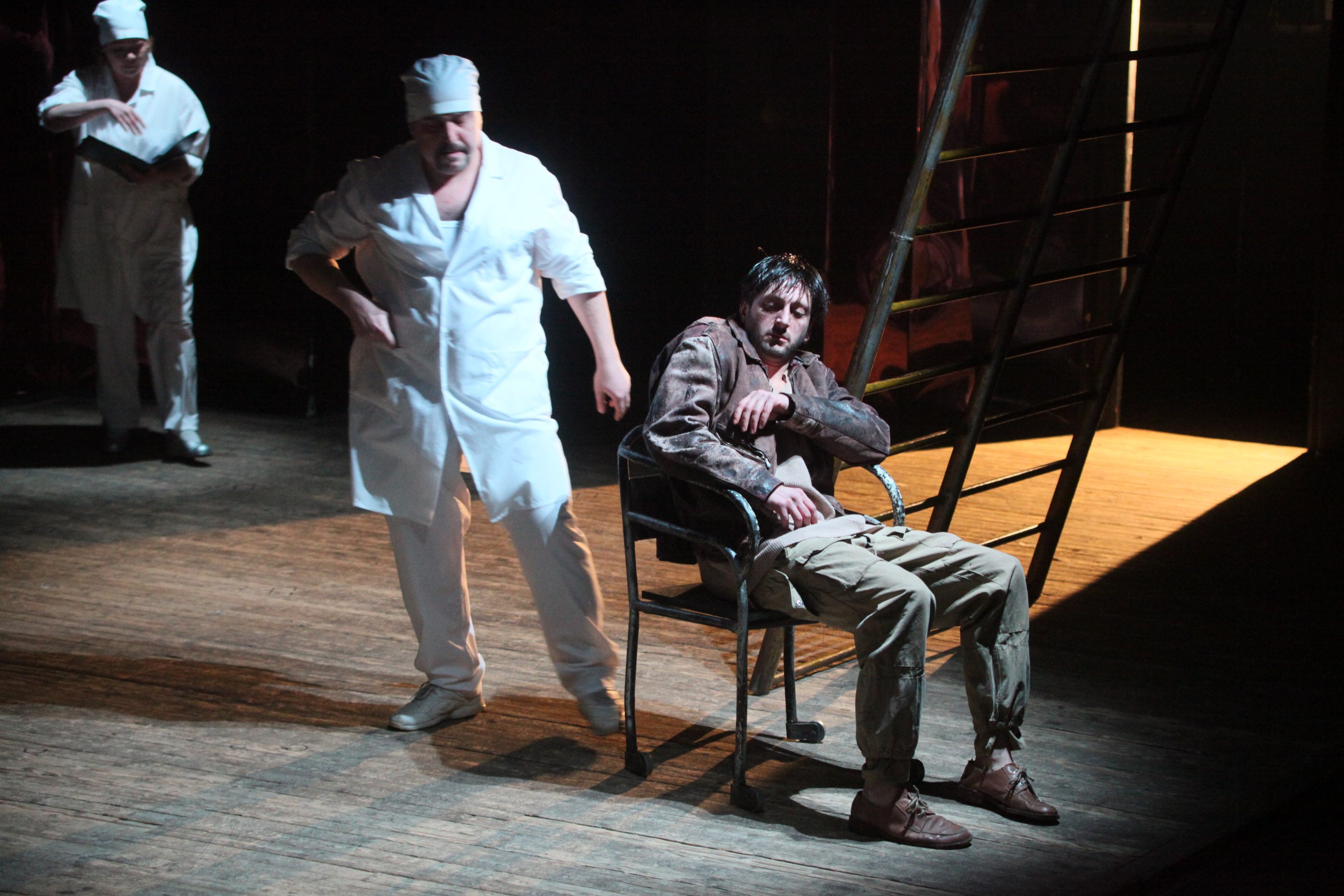 Надо сказать, что режиссер тоже немало сгладил углы и смягчил по-настоящему кровавую жестокость пьесы, убрал с глаз публики почти все моменты физических избиений и откровенных издевательств медперсонала над убогими. Именно эта деталь сделала спектакль более проникновенным в смысле зрительского душевного участия, поскольку для катарсиса и работы души не так уж необходимо визуальное зло. Режиссер не менее чутко, чем драматург уловил этапы развития общества — если тридцать лет назад восприятие было более прямолинейным, то сейчас просвещенный театрал уже готов к внутренней обработке информации, к умозрительной оценке происходящего на подмостках. Структурно спектакль опирается на несколько важных и исполнительски — блестящих сцен. Лирическая, дающая небольшую передышку от волны трагедии, так хорошо решена в постановке мизансцены, в наполненности музыкой и точной работе света, что героям Тагиева и Ярлыковой (Натали) можно было бы уже ничего и не делать. Высокий шутовской смысл сцены обретения Гуревичем и Прохоровым спирта и сопровождающей ее песни, смешны и понятны, пожалуй, только своим, только в России. Колдовство, сатанинское начало Вальпургиевой ночи, переданные в сумасшедшем танце и монотонном мужском пении, наверное, самая выразительная часть постановки. Пение, похожее на заклинание, на камлание, бубнеж на одной ноте придает пьесе о советской действительности оттенок пугающей готической мистики, страшного ведьминского шабаша. Заключительная сцена спектакля абсолютно режиссерская, авторская, уводящая от Ерофеева к Беляковичу. Одна из тех, которые так хорошо умел делать Мастер, от которой душа будто бы на мгновение воспаряет над телом и уносится по лестницам декораций вверх, через потолок к небу.