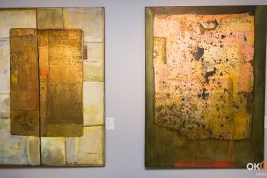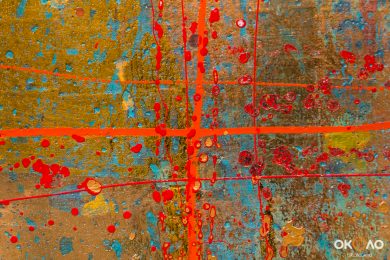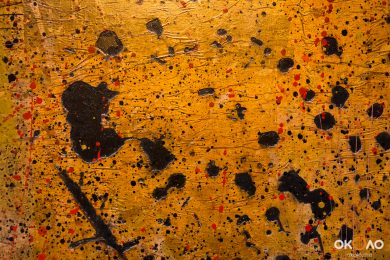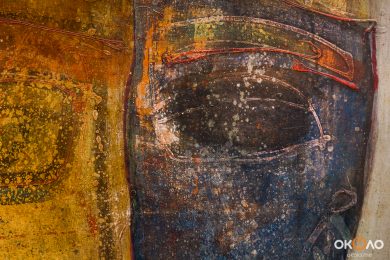 Владимир Назанский: Для зрелого, позднего периода творчества Богомолова, начиная с конца 80-ых, а тем более в 90-ые и нулевые годы, характерно обращение к поздней античности, Византии, может быть, древней Руси эпохи Вольного Новгорода, эпохи Феофана Грека. Причем это не какое-то цитирование – это современное искусство, использующее современные художественные коды, но, в то же время, это как бы такое воспоминание о тех временах, словно в каких-то других перевоплощениях Богомолов ходил по улицам Константинополя или Вольного Новгорода. В классической работе об искусстве первой половины XX века «О духовном в искусстве» отход от буквального копирования реальности объясняется возвращением к духовной стороне искусства. То же самое можно сказать про Глеба Богомолова. Возможно, его историческая скорбь отчасти связана и с его блокадным детством. С его послевоенным периодом, когда он летом жил в Царском селе среди руин невосстановленных дворцов и храмов, и эти руины классической эпохи могли им особым образом ощущаться. Мне кажется, это как раз такое Петербургское ощущение человека с особым чувством истории и переживанием утраты. Но это лишь одна из версий его обращения к этой теме. Он тщательно пишет утраты на поверхности красочного слоя. Иногда они носят характер округлых форм, словно следы пуль.