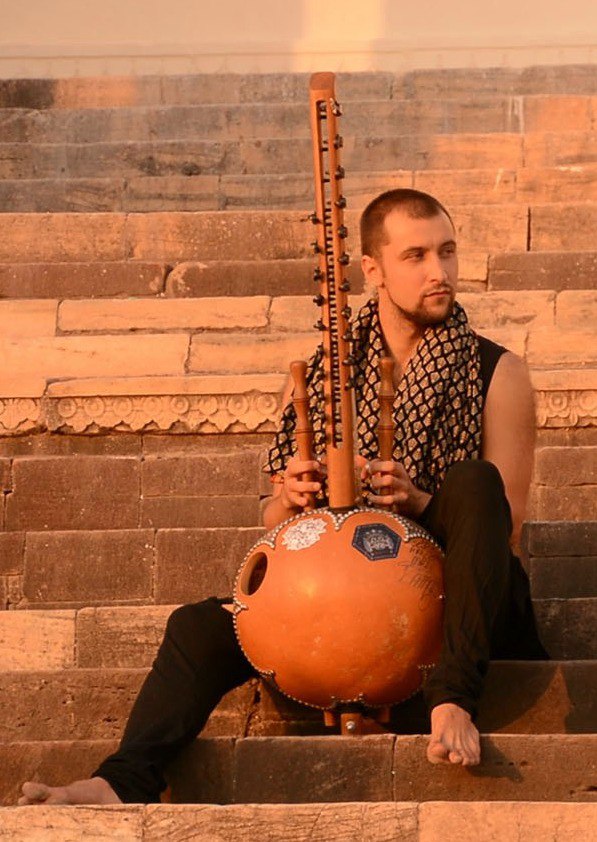 Второе отделение открывает поистине уникальный инструмент. Сергей Калачёв, по словам конферансье, – единственный в России концертирующий исполнитель на коре, африканской арфе.