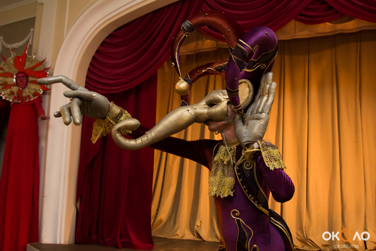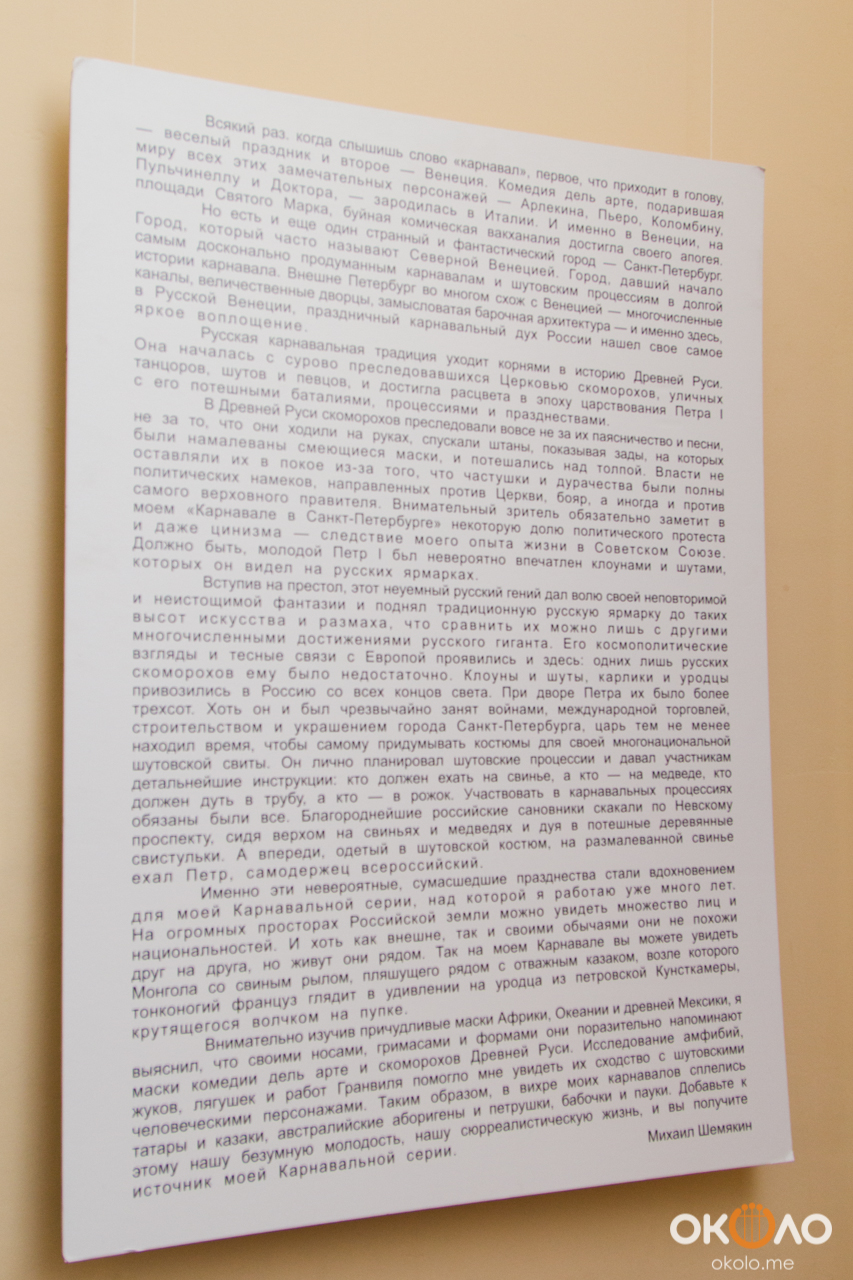 Театр, во всем его гротесковом, порой полемическом и всегда неожиданном прочтении проникает и в станковые произведения Михаила Шемякина, представленные на выставке серией «Карнавалы Санкт-Петербурга». Буйство красок, строго организованных благодаря изысканной линии рисунка, точность в передаче деталей костюма и масок навеяли художнику подмостки площадной комедии дель арте. Костюмы и фотографии со знаменитых карнавальных шествий, организованных Михаилом Шемякиным в Венеции и Санкт-Петербурге, привносят в экспозицию дух старинного праздника. Все это соседствует на выставке с кадрами, сделанными на московском фестивале «Спасская башня» в 2012 году, на который Михаил Шемякин был приглашен в качестве главного художника. Запечатленный эпизод «Всадники смерти и Колесо Войны» стал одним из самых ярких моментов фестиваля.