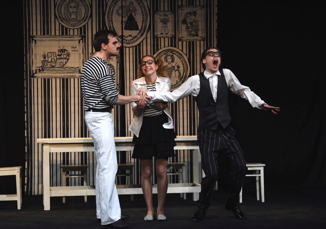 На самом деле, произошло полное погружение в атмосферу немого кинематографа еще и благодаря декорациям и великолепной игре актеров. Черная сцена время от времени закрывалась черным занавесом, служившим экраном, на который транслировались отрезки оригинальных немых фильмов. Актерам на все сто удалось справиться с явным переигрыванием, свойственным жанру немого кино. Честно говоря, я несколько раз за весь спектакль ловила себя на мысли, что мне кажется, будто я смотрю настоящий немой фильм. На минуту я осознавала, что это происходит все-таки на сцене театра, но после снова погружалась в атмосферу именно кинематографа. А раз зритель поверил, что он смотрит не спектакль, а настоящее кино, значит, создатели смогли выполнить главную свою задачу.