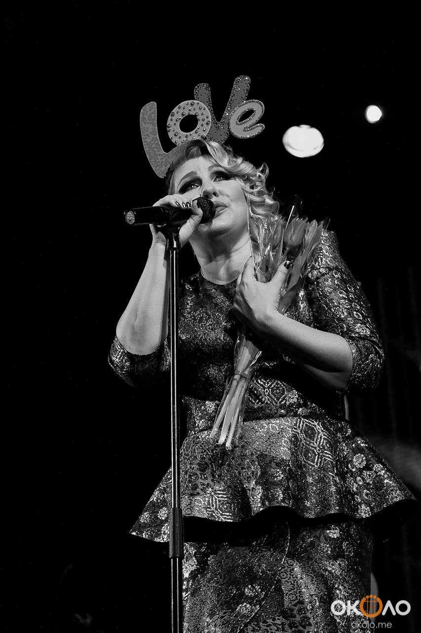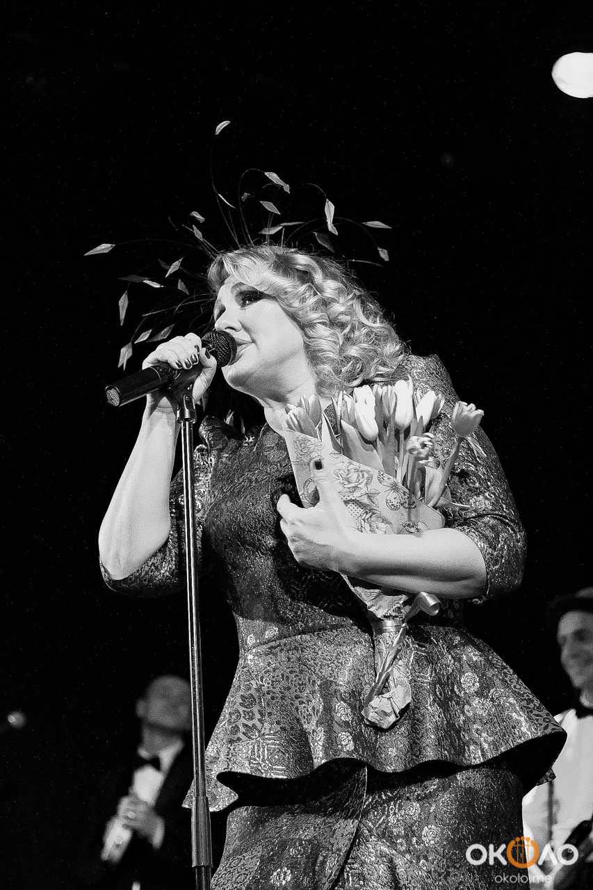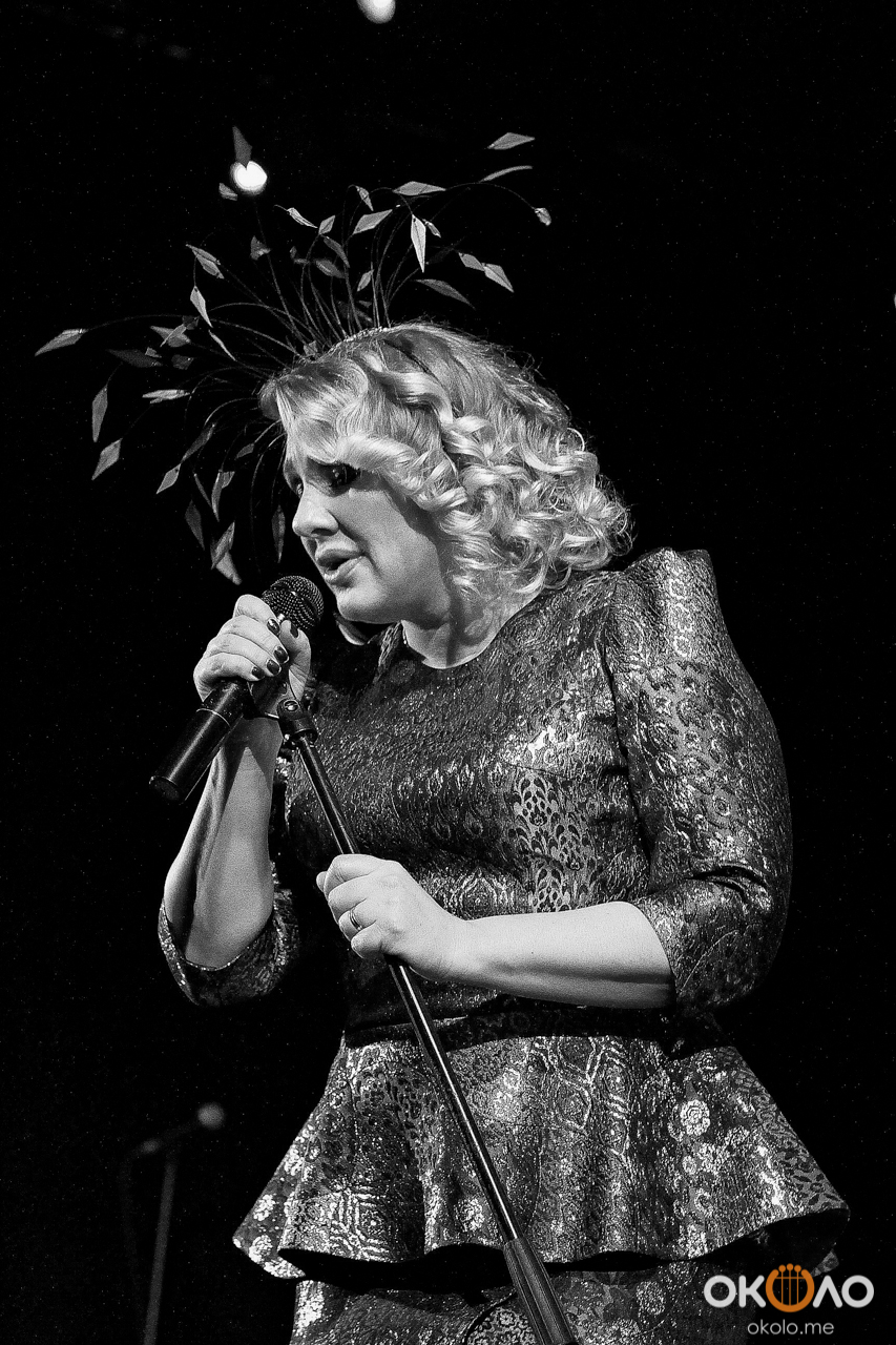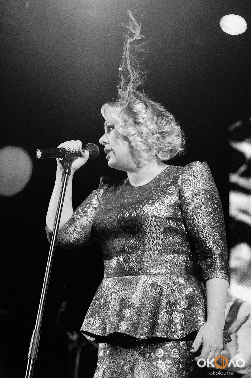 И тут появляется она — восхитительная и непохожая на других Ева Польна. В шикарном золотисто-красном платье с накидкой и с головным убором похожим на корону Ундины. Выступление певица начала с песни «Драма». Абсурдно, но, как человек, выросший на песнях Евы и ни разу не бывавший на её концертах до этого, я думала, что название песни, будет как раз соответствовать атмосфере. И только я приготовилась взгрустнуть, вспоминая былую молодость, как тут же меня ждала приятная неожиданность: несмотря на лиричные песни о любви, сама певица оказалась совсем иной. Яркая, раскрепощённая, прямолинейная, сильная женщина с отличным чувством юмора. А её пластике можно только позавидовать!