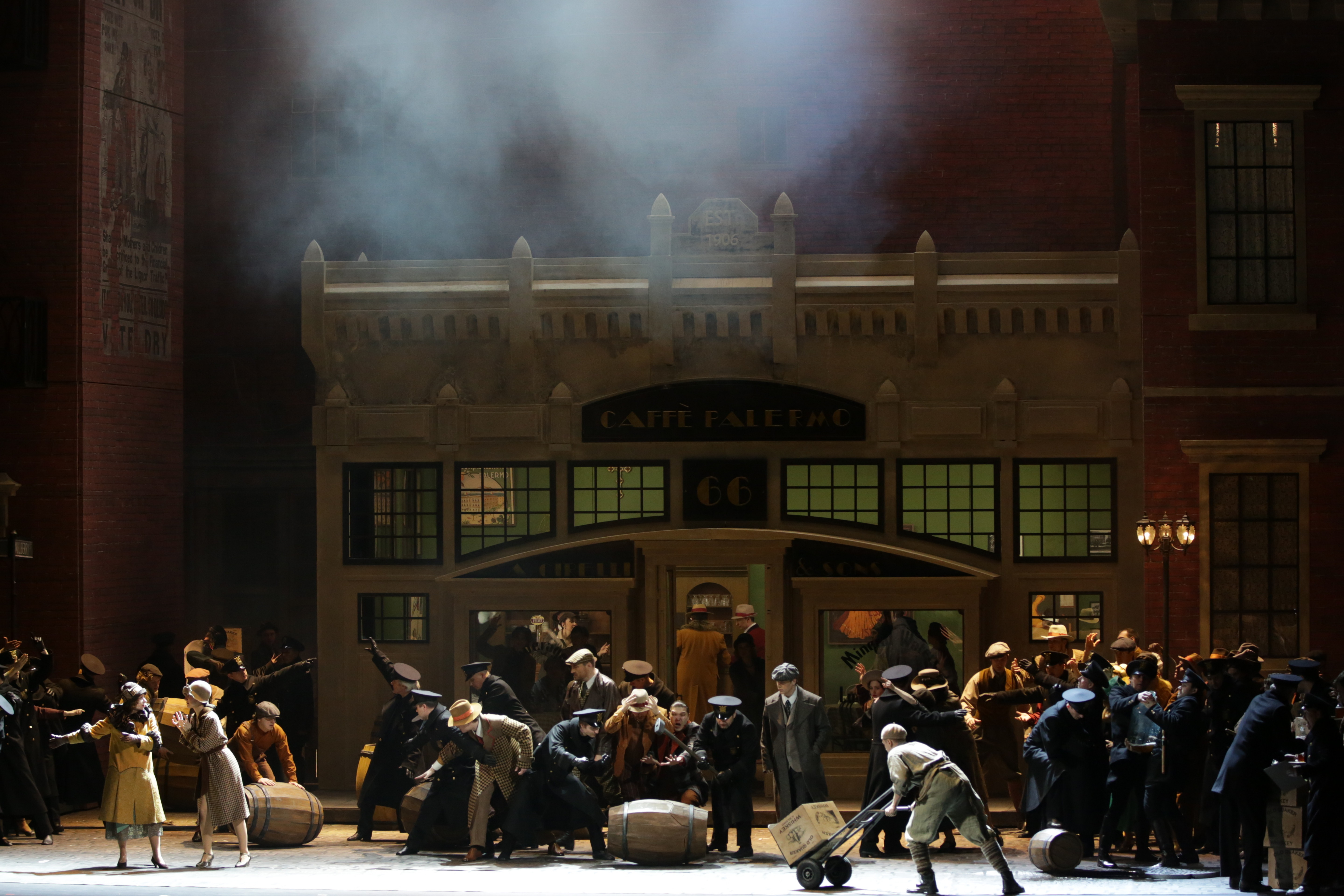 Для постановки пятиактной оперы, сочиненной по французским лекалам «большой романтической оперы» предоставили обширную Новую сцену Мариинского театра. Для многофигурных, действенных массовок и хоровых сцен, коих в опере немало, эта площадка подходит идеально. Сценограф Камилла Дуга возвела на ней уголок «Маленькой Италии» — района Нью-Йорка, где и сегодня компактно проживают итальянцы – потомки тех эмигрантов, что прибыли в Америку в начале ХХ века.