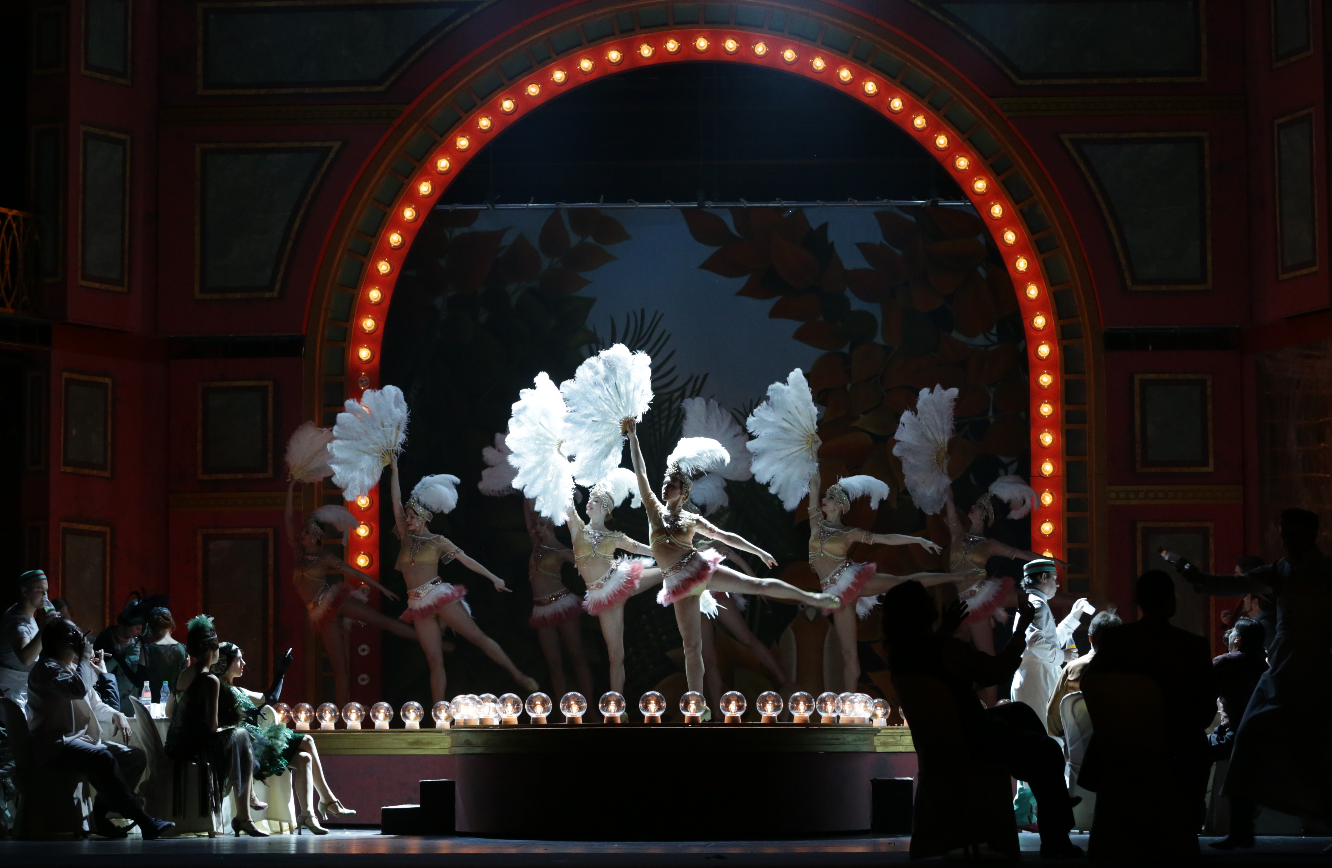 Арно Бернар – личность в Петербурге не вовсе неизвестная. В 2010 году он поставил в Михайловском театре «Иудейку» Галеви, а в 2011 – «Богему» Пуччини. Тот, кто видел эти спектакли, не мог не заметить, что у режиссера есть собственные постановочные клише – действенные приемы, с помощью которых он ловко структурирует драматургию спектакля, отчленяя границы сцен при помощи черных ширм или внезапных остановок движения в массовке. Получаются выразительные «живые картины», замершие, остановленные на бегу, на полувздохе: с воздетыми руками и вытаращенными глазами, как в игре «замри-отомри». Меж застывших скульптурных групп из плоти и крови бродят и поют персонажи, у которых в этот момент есть, что петь. Во время таких остановок зритель получает возможность оценить важность момента – в такие минуты герои заняты мысленным монологом, время как бы останавливается для них. А заодно рассмотреть в деталях кричаще яркие – вырви глаз! — цвета костюмов в стиле «Великий Гэтсби». Пиджаки в клеточку, шляпы-канотье, с атласными лентами, повязанными на тулье, широченные штанины брюк … половодье красок слегка умеряется черными мундирами полицейских. Цветовая гамма костюмов, придуманных Марианной Странска, вызвала, между тем, обоснованные сомнения. Дело даже не в подчеркнутой яркости цветов, но в очевидном колористическом диссонансе. Цвета костюмов катастрофически не сочетались друг с другом и с оттенками стен и декора. Это было не просто буйство, но какофония красок, фактур и форм: чего стоили лацканы пиджаков контрастных цветов, или терракотово-кирпичный костюм главного заговорщика, на малиновом фоне плюшевых драпировок… Возможно художница создала карикатуру на гангстерский стиль одежды – нечто вроде малиновых пиджаков «новых русских» в 90-е. Но даже это не может служить оправданием – дисгармоничная цветовая каша на сцене просто оскорбляла взор.
