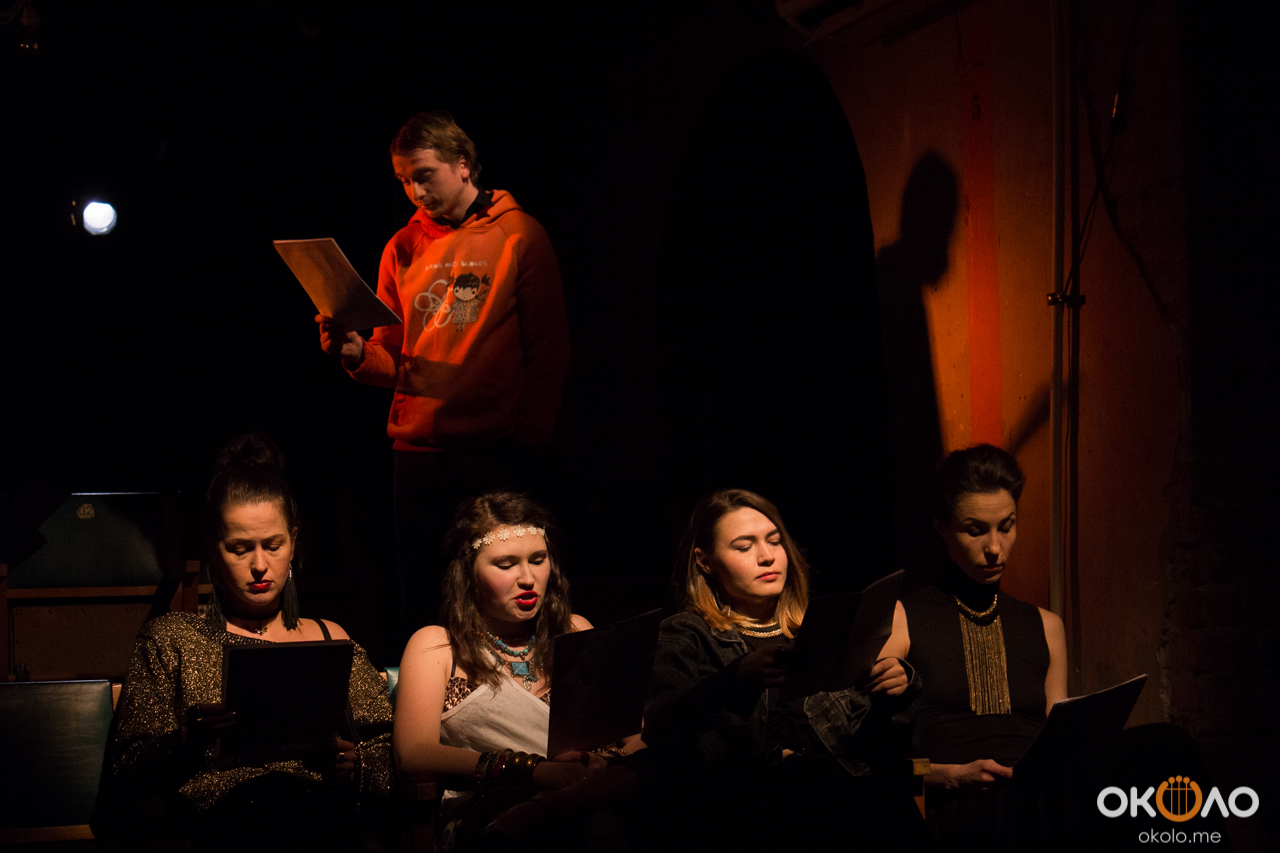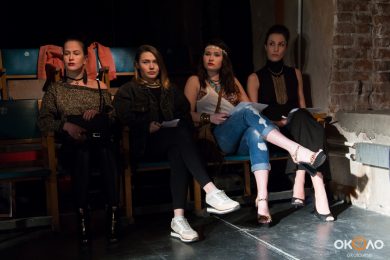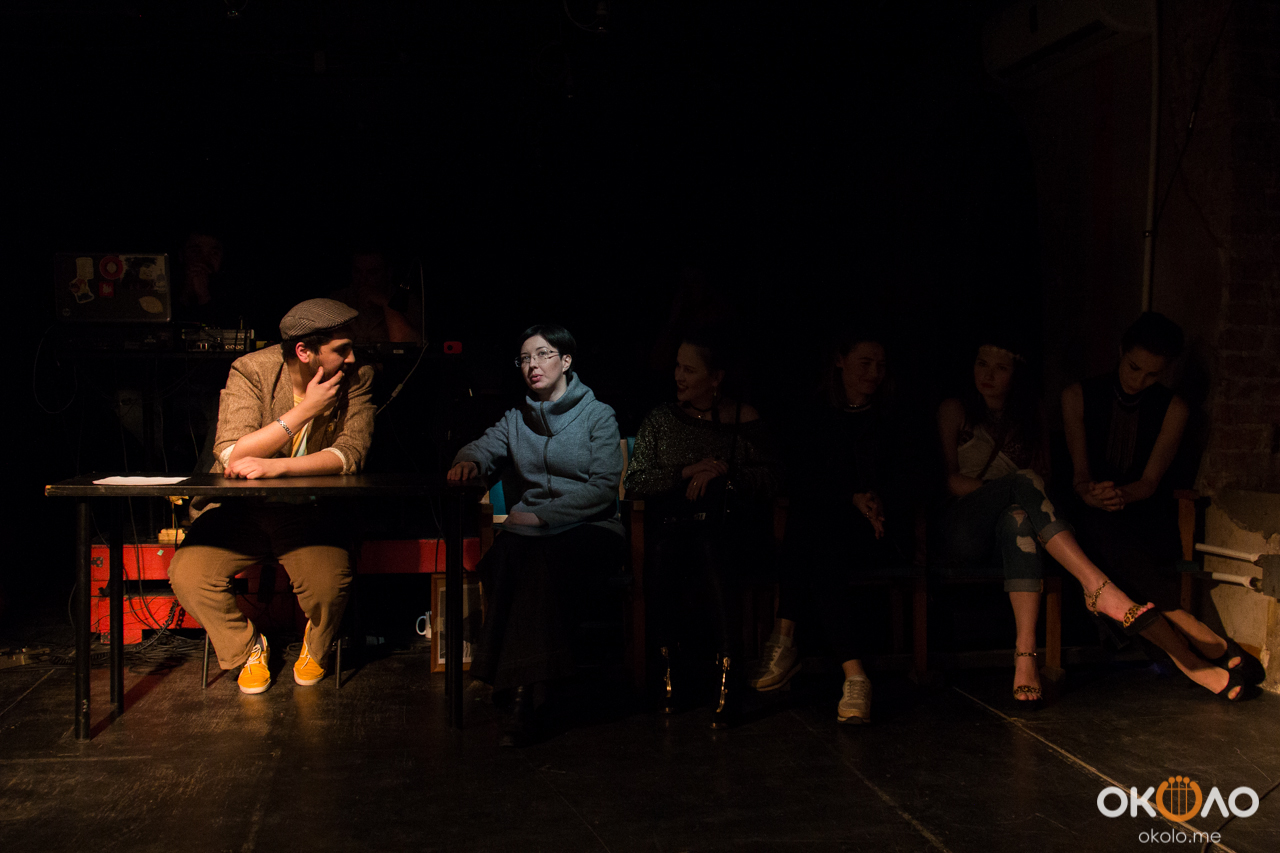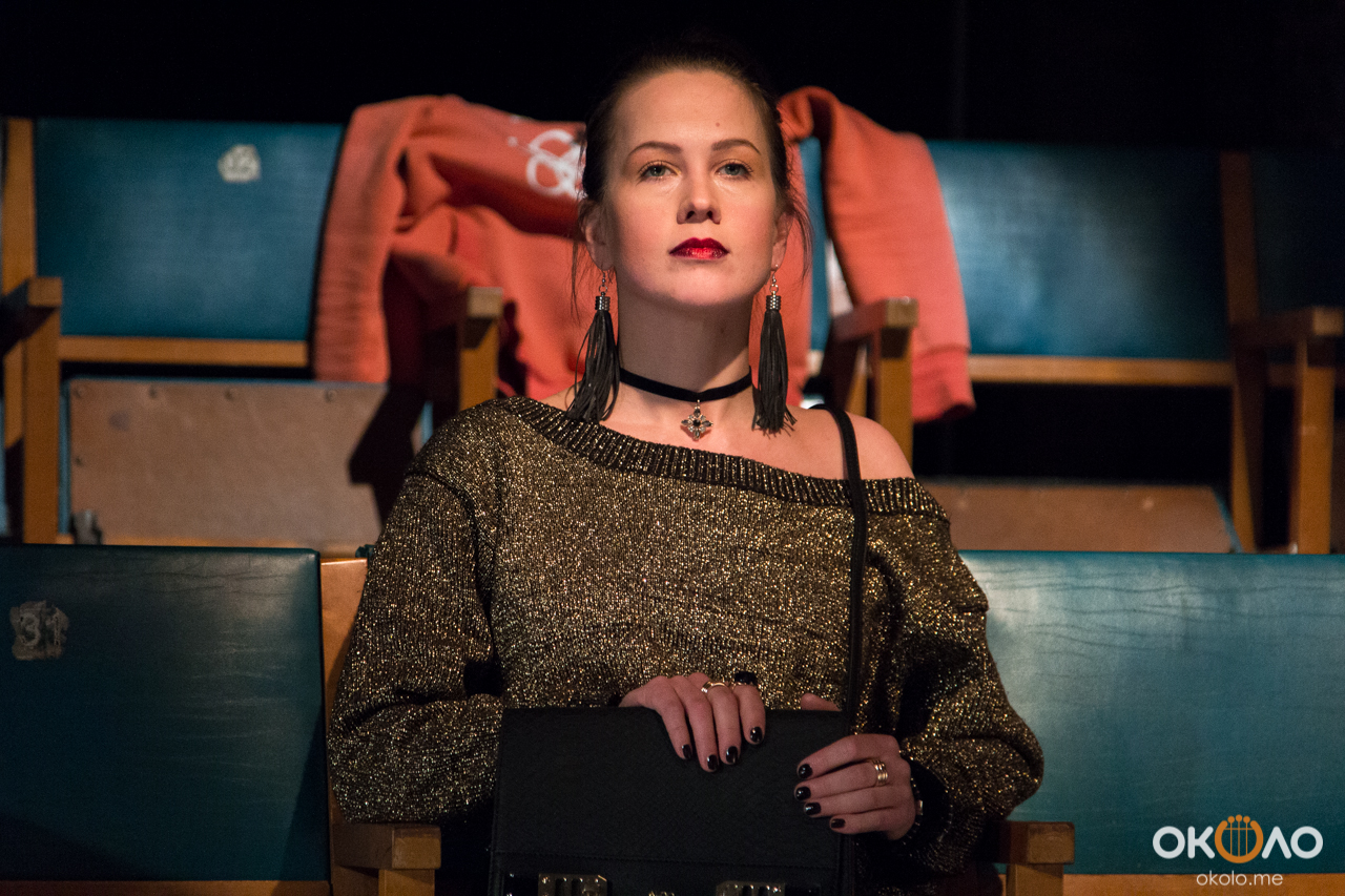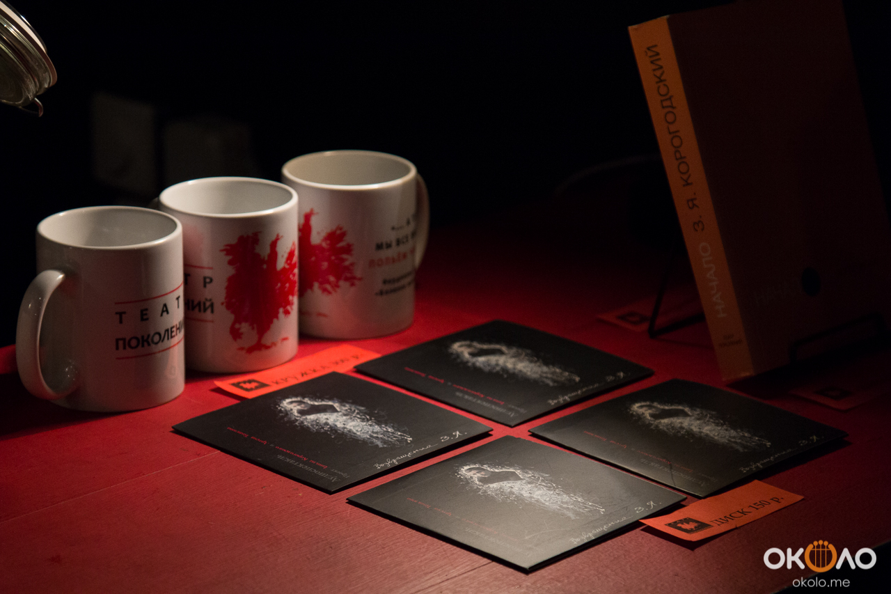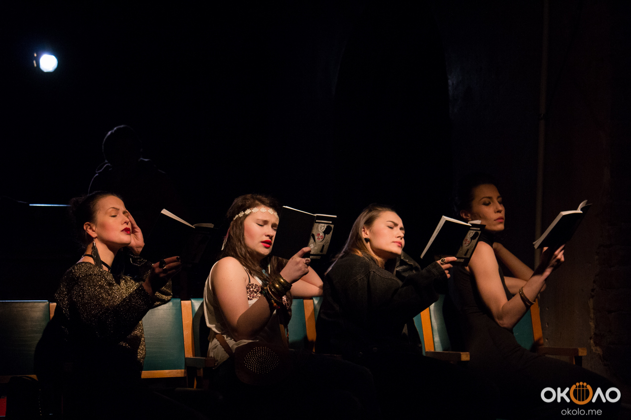 Пройдя в зал, зрители оказывались как бы на репетиции спектакля. Все было устроено так, чтобы границы реальности оказались максимально размыты, а четвертая стена снесена напрочь. Актрисы, они же хор, они же зрители, они же этапы из жизни лирического героя, появившиеся на сцене первыми, усаживались в кресла из зрительного зала, установленные на сцене.