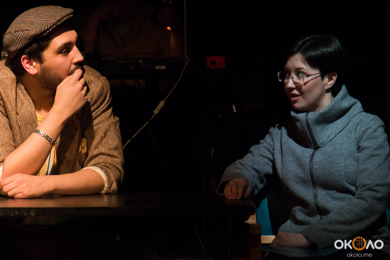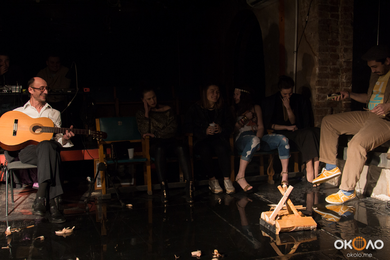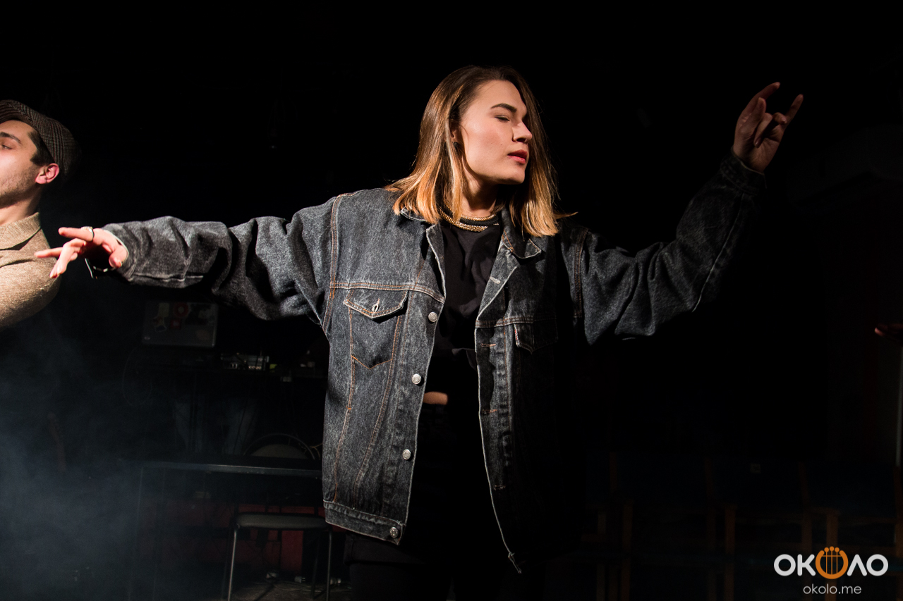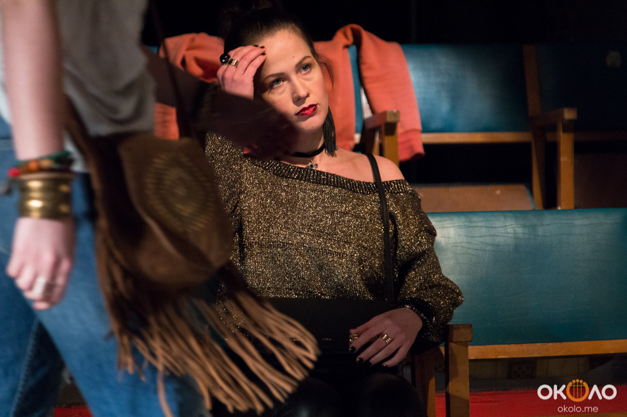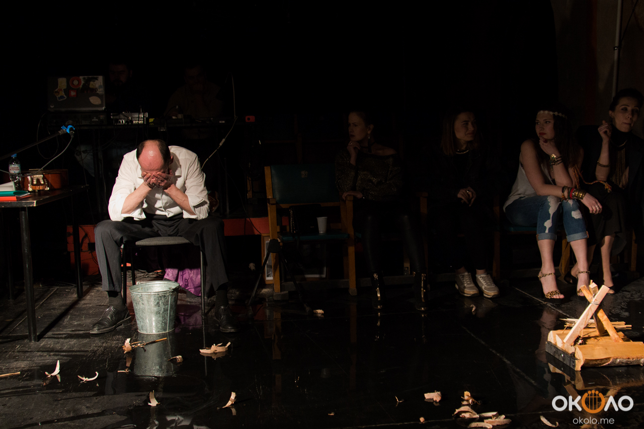 Пройдя в зал, зрители оказывались как бы на репетиции спектакля. Все было устроено так, чтобы границы реальности оказались максимально размыты, а четвертая стена снесена напрочь. Актрисы, они же хор, они же зрители, они же этапы из жизни лирического героя, появившиеся на сцене первыми, усаживались в кресла из зрительного зала, установленные на сцене.