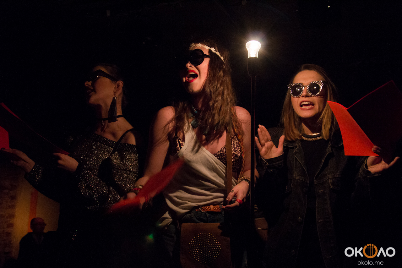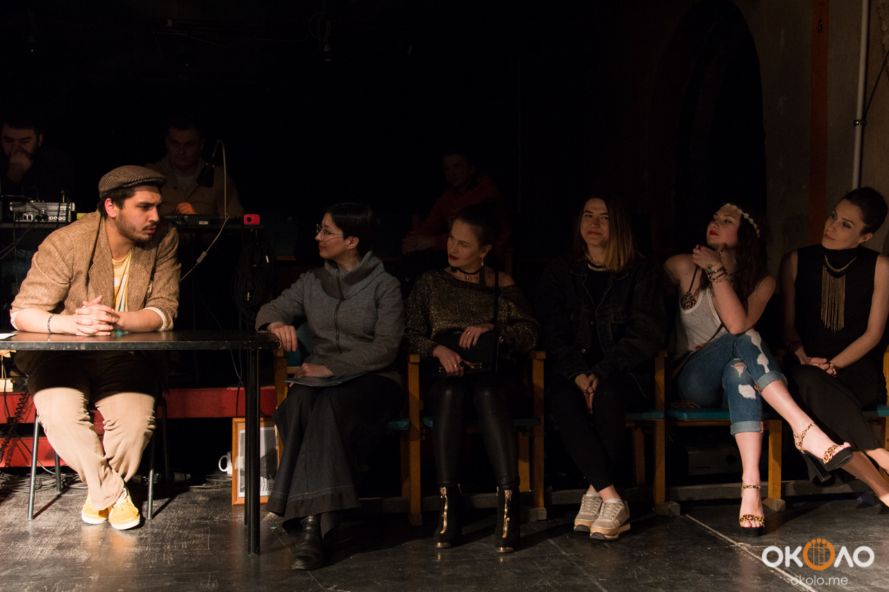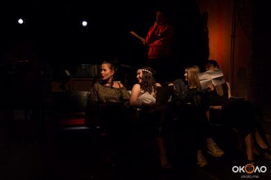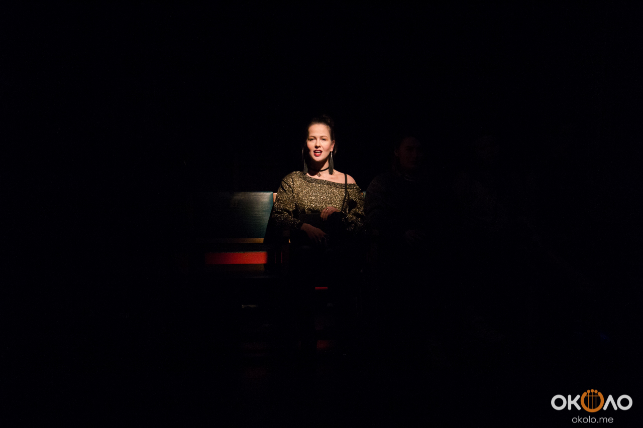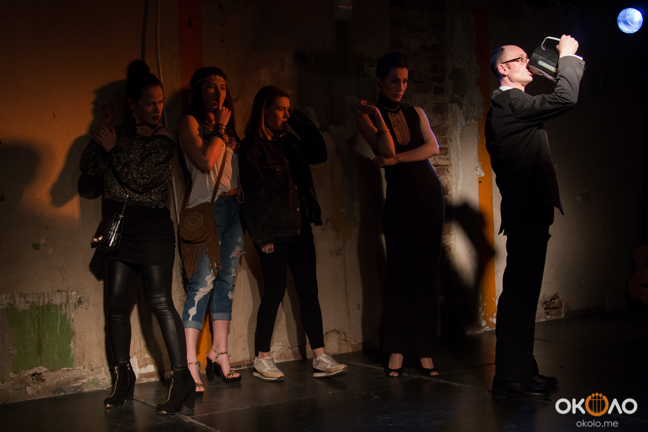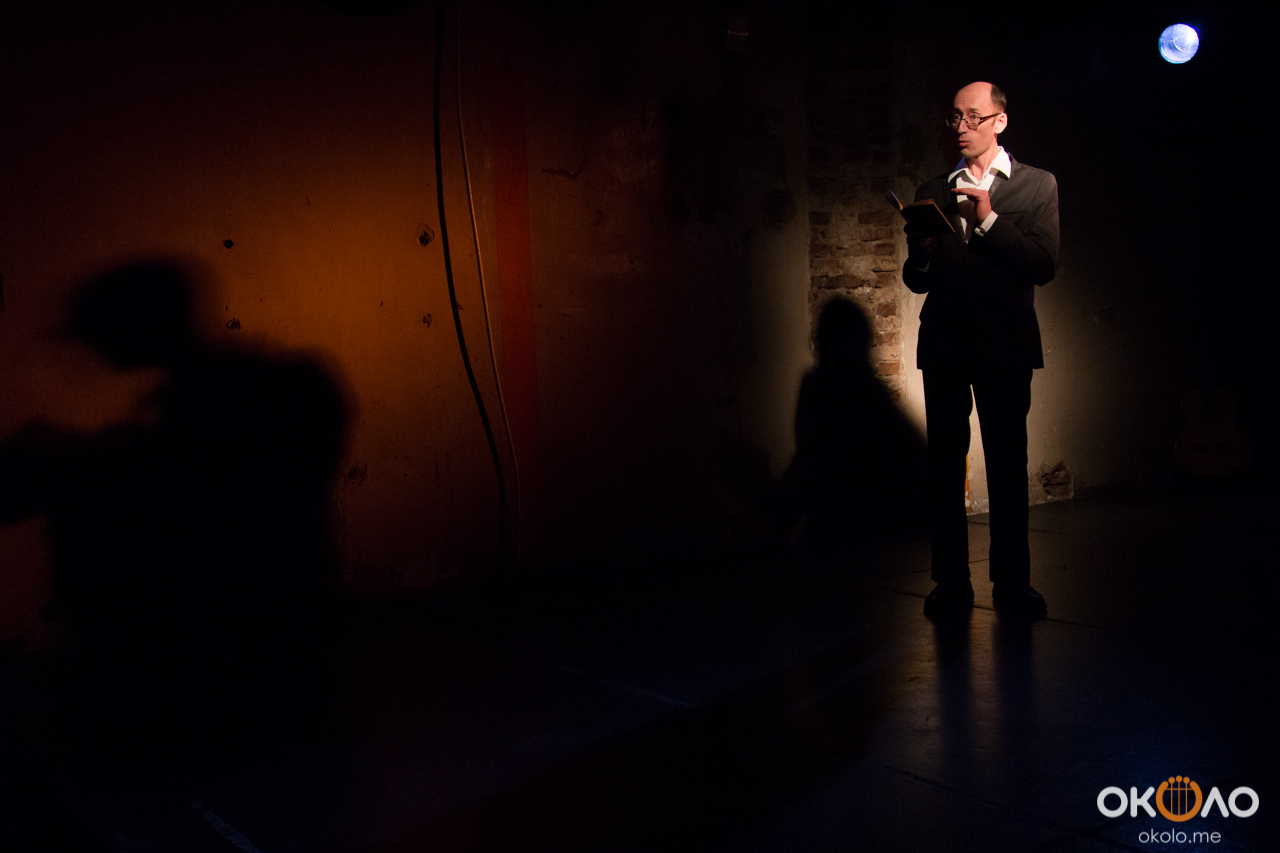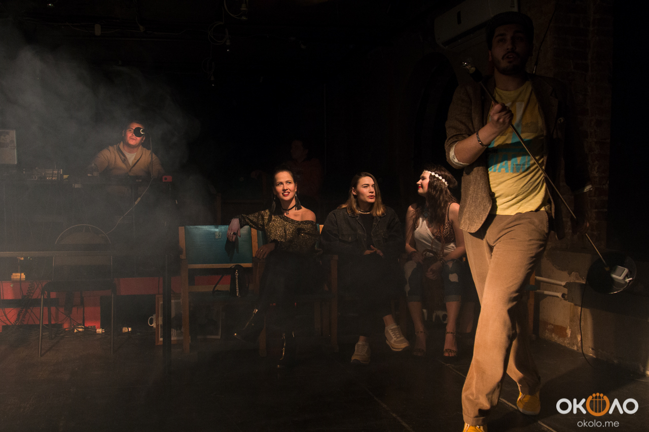 Пройдя в зал, зрители оказывались как бы на репетиции спектакля. Все было устроено так, чтобы границы реальности оказались максимально размыты, а четвертая стена снесена напрочь. Актрисы, они же хор, они же зрители, они же этапы из жизни лирического героя, появившиеся на сцене первыми, усаживались в кресла из зрительного зала, установленные на сцене.