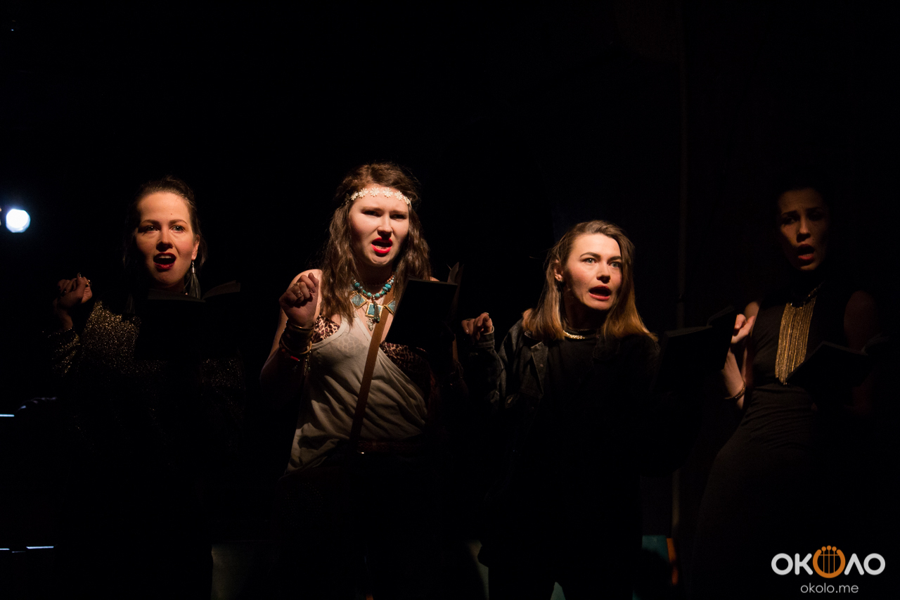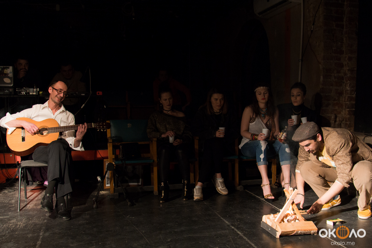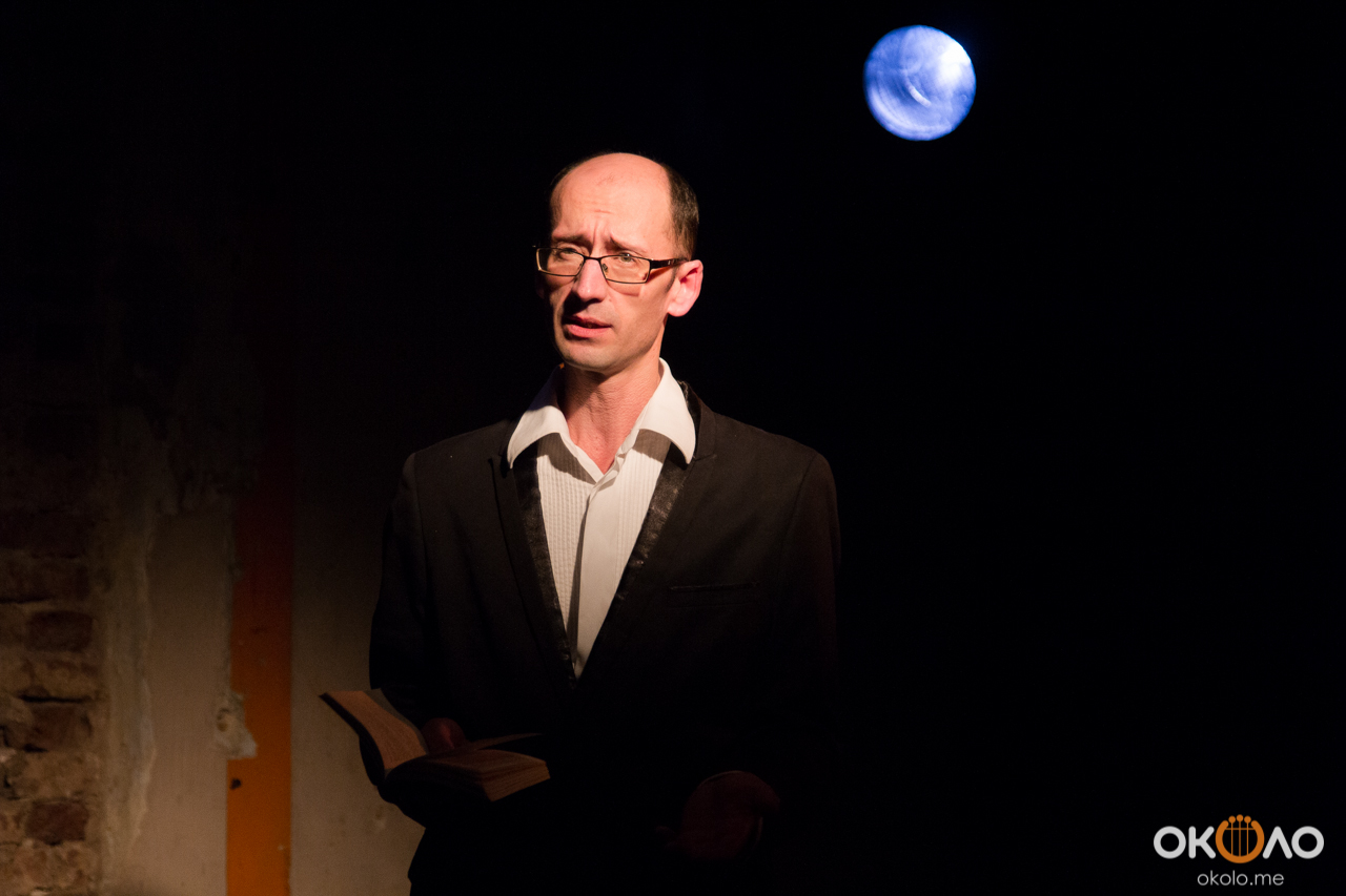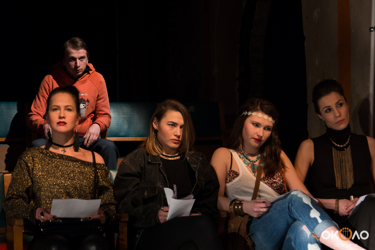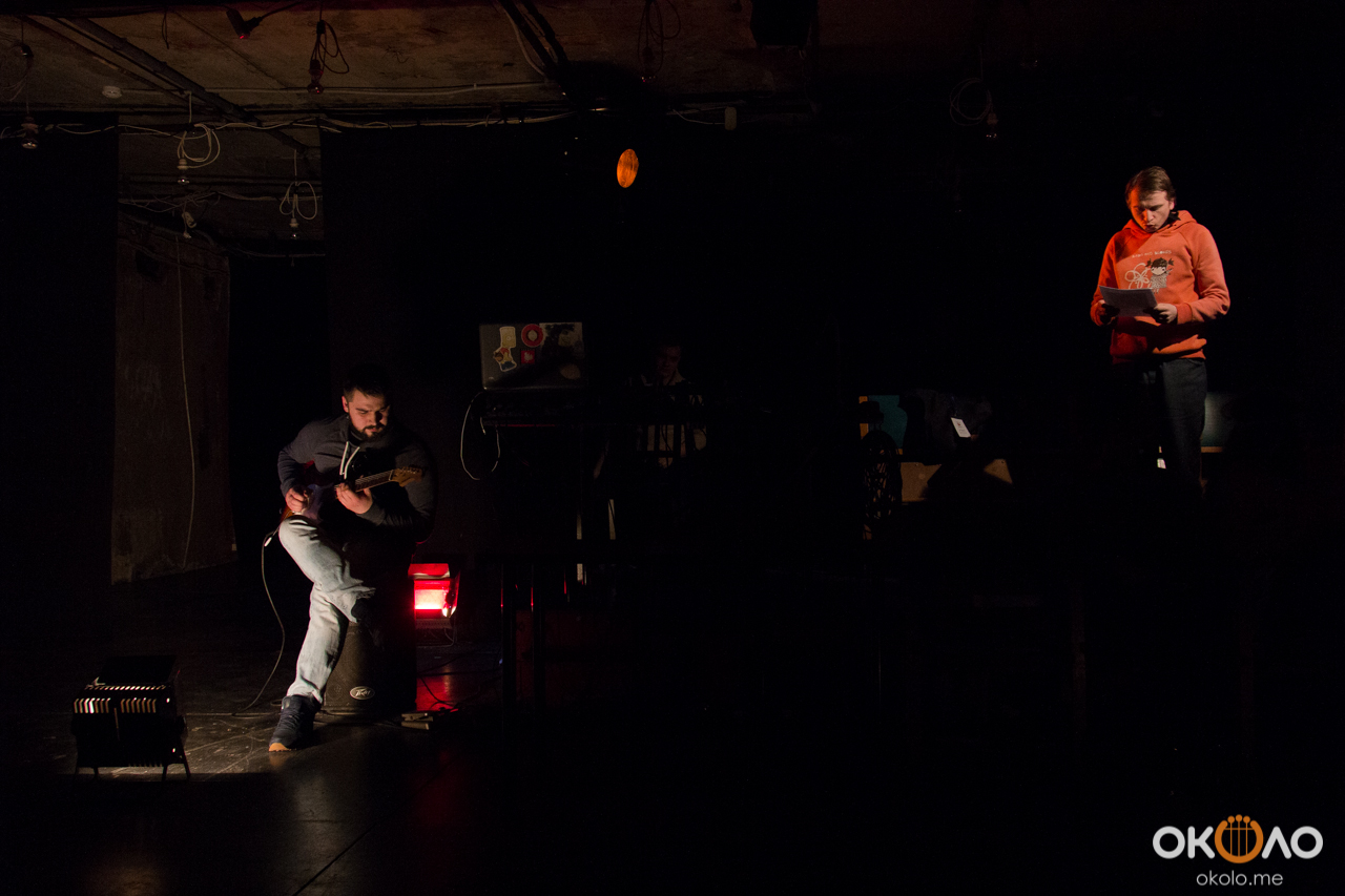 Пройдя в зал, зрители оказывались как бы на репетиции спектакля. Все было устроено так, чтобы границы реальности оказались максимально размыты, а четвертая стена снесена напрочь. Актрисы, они же хор, они же зрители, они же этапы из жизни лирического героя, появившиеся на сцене первыми, усаживались в кресла из зрительного зала, установленные на сцене.