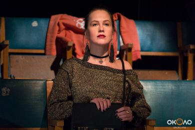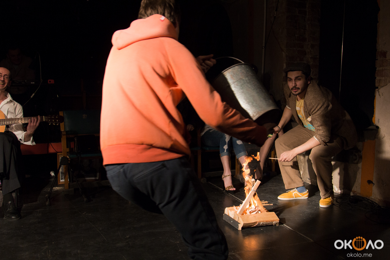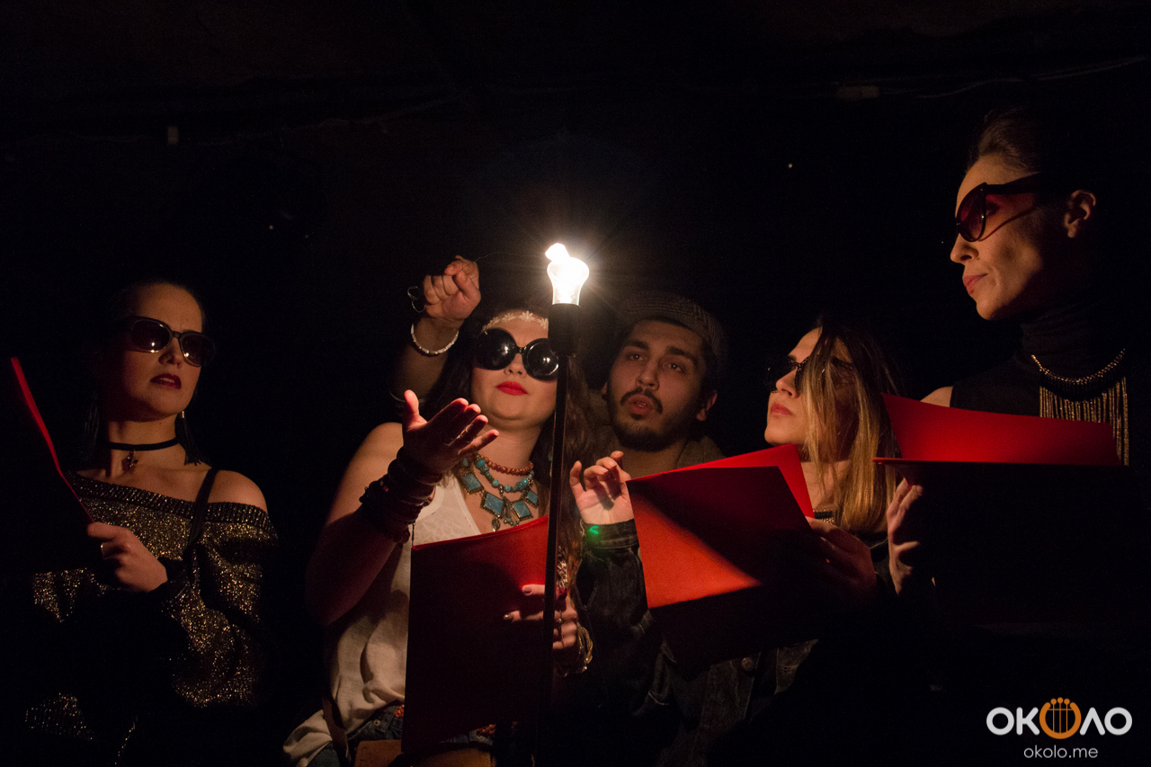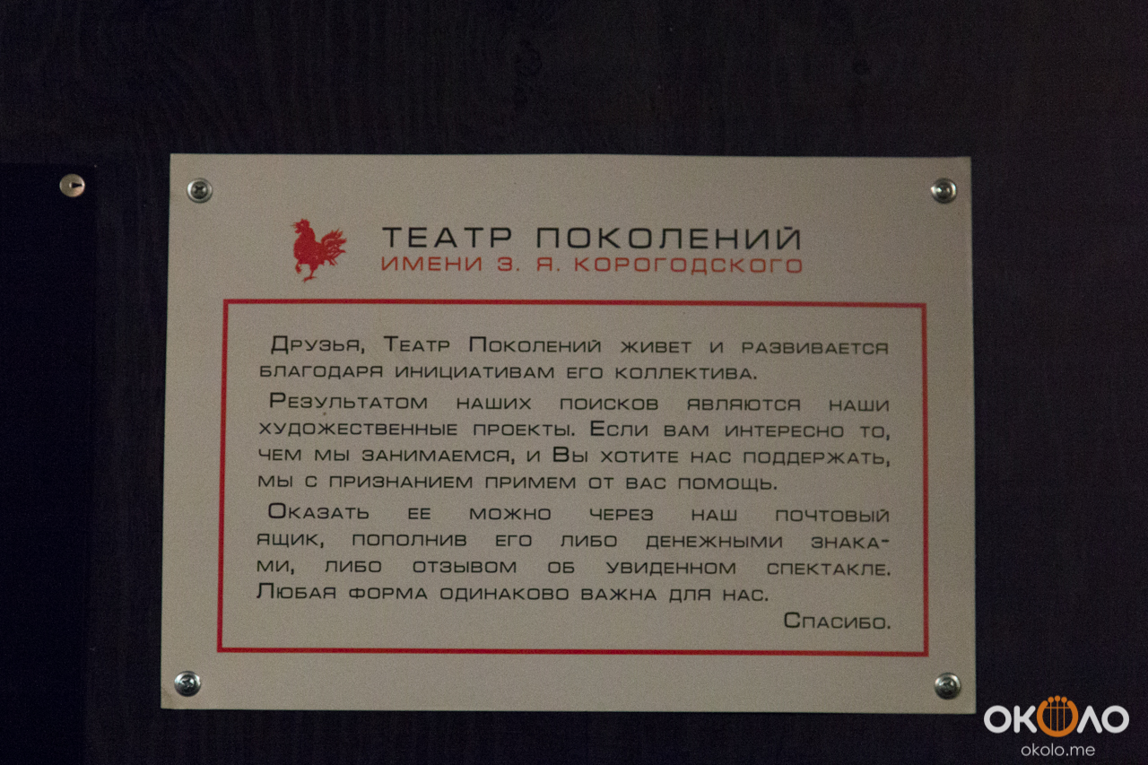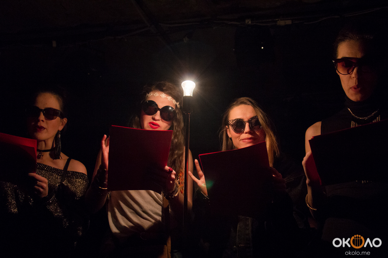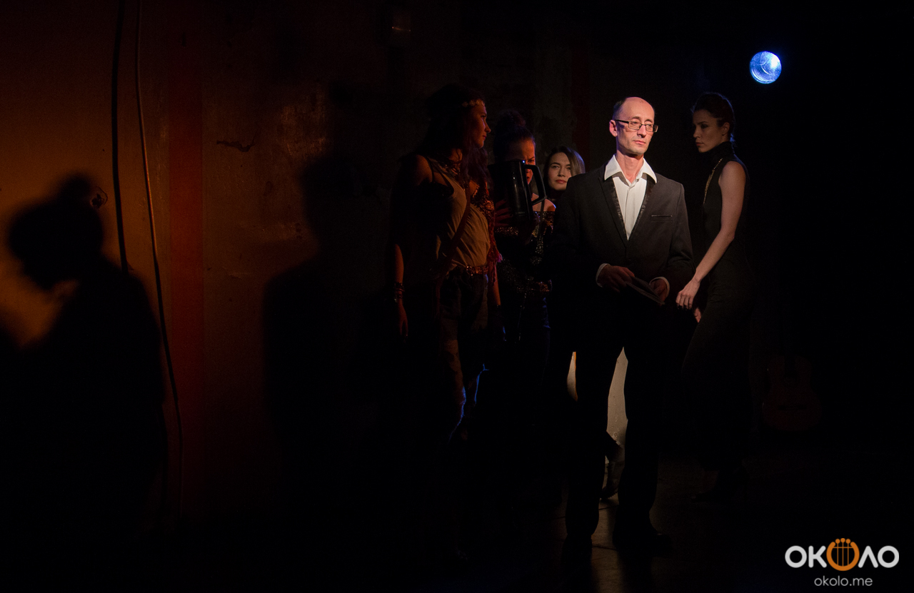 Пройдя в зал, зрители оказывались как бы на репетиции спектакля. Все было устроено так, чтобы границы реальности оказались максимально размыты, а четвертая стена снесена напрочь. Актрисы, они же хор, они же зрители, они же этапы из жизни лирического героя, появившиеся на сцене первыми, усаживались в кресла из зрительного зала, установленные на сцене.
