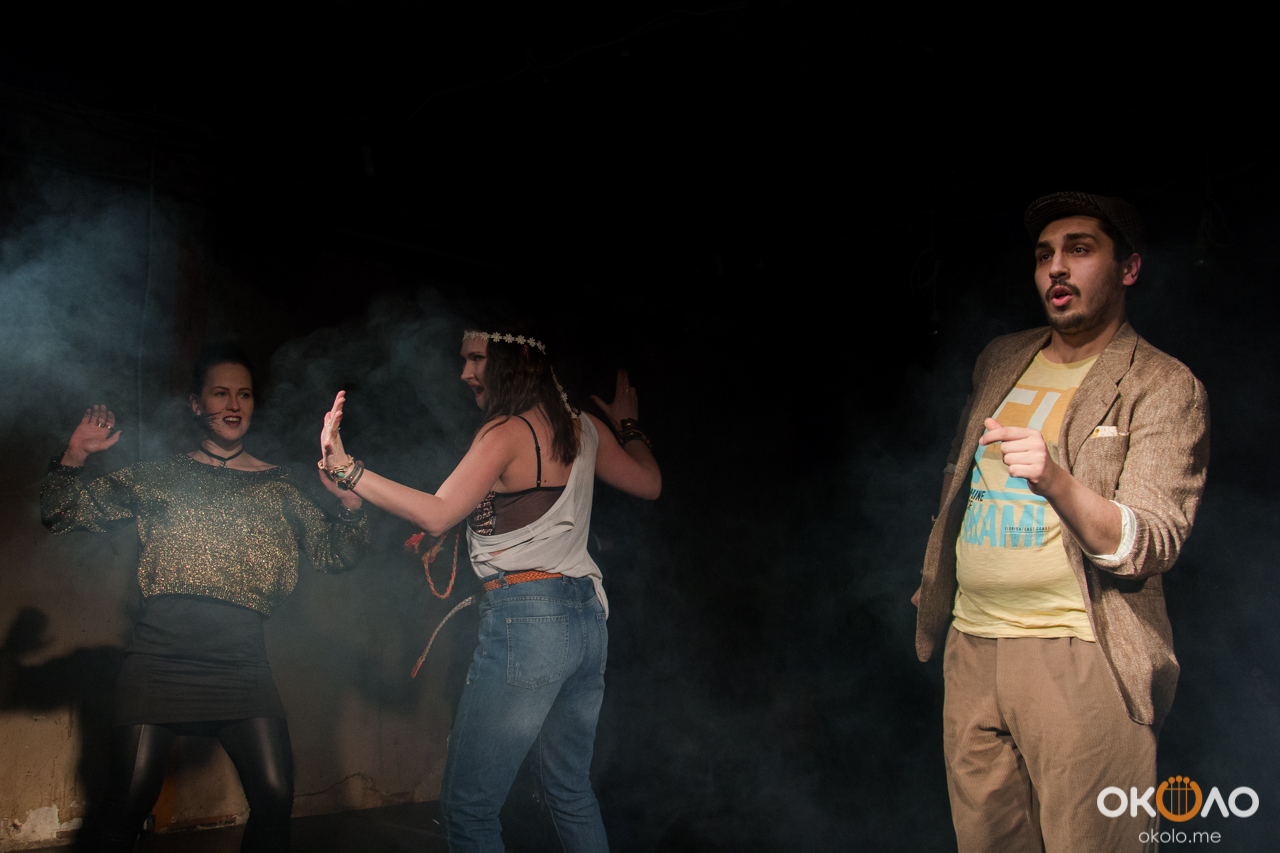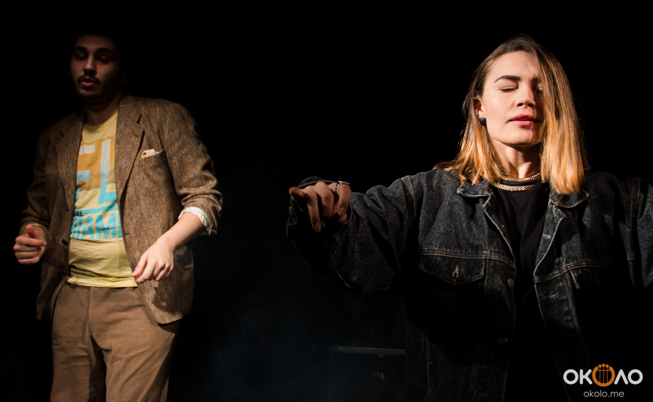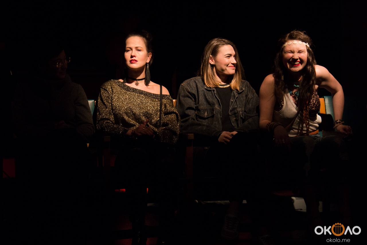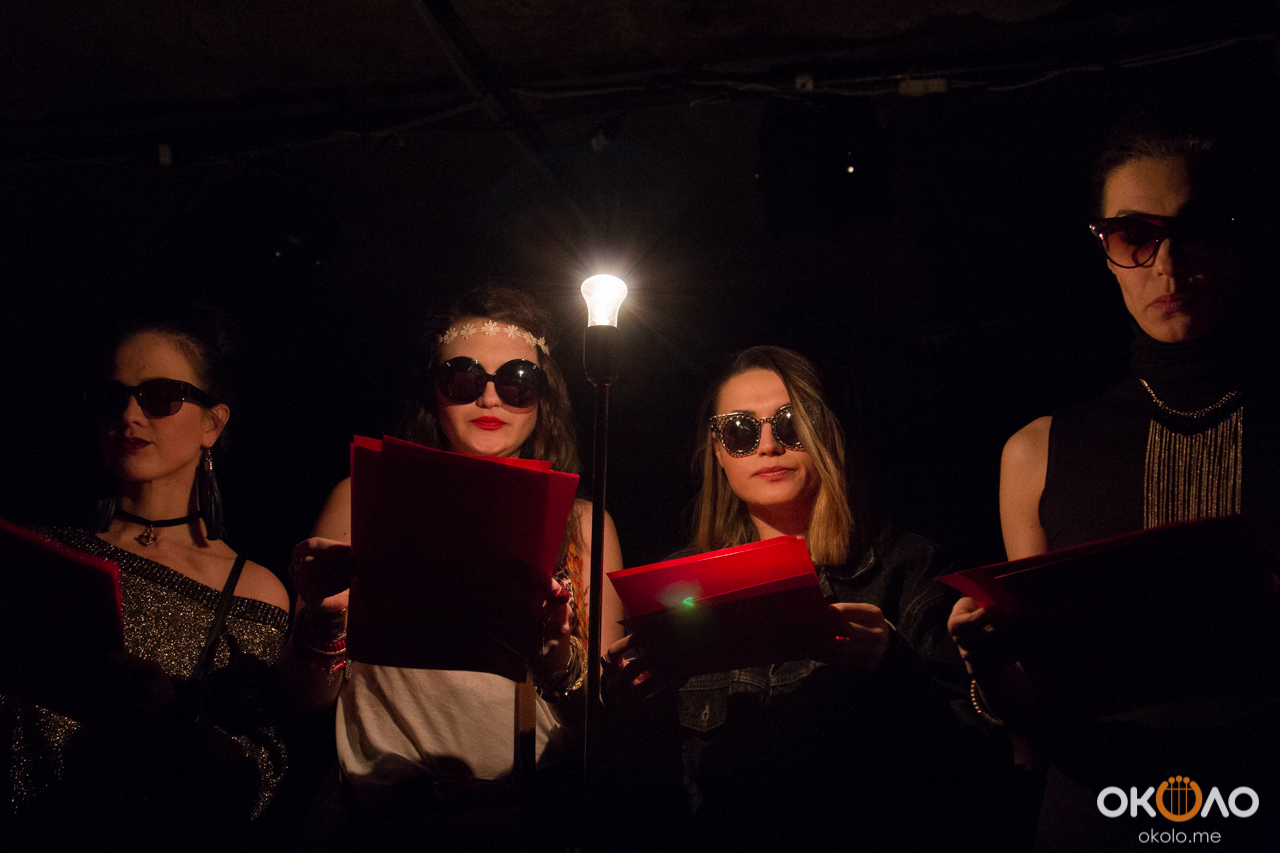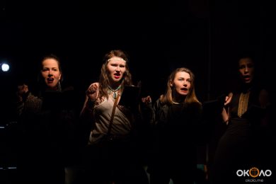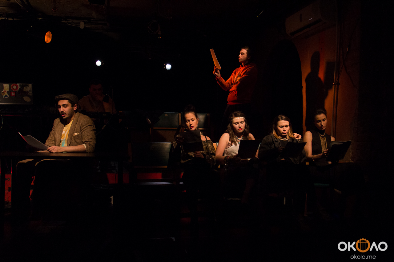 Пройдя в зал, зрители оказывались как бы на репетиции спектакля. Все было устроено так, чтобы границы реальности оказались максимально размыты, а четвертая стена снесена напрочь. Актрисы, они же хор, они же зрители, они же этапы из жизни лирического героя, появившиеся на сцене первыми, усаживались в кресла из зрительного зала, установленные на сцене.