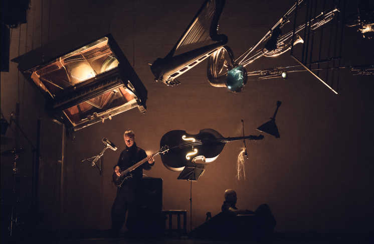 Само же пространство спектакля как бы замерло между небом и землей – над сценой парят зависшие в воздухе арфы, контрабасы, валторны… В глубине, лишь слегка выхваченные светом, творят непрерывную магию звуков музыканты группы ADAEN с бас-гитарой и ударными. К ним будут присоединяться и герои спектакля: Спирид — Марголин надолго срастется с клавишными, чтобы аккомпанировать безумному, страстному танцу обвязанной кожаными браслетами да серебряными кольцами Панночки (Александра Басова) и Хомы в рокерской сетчатой рубахе и рваных брюках с крестом на бедре.