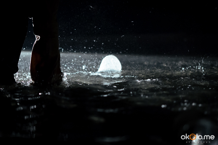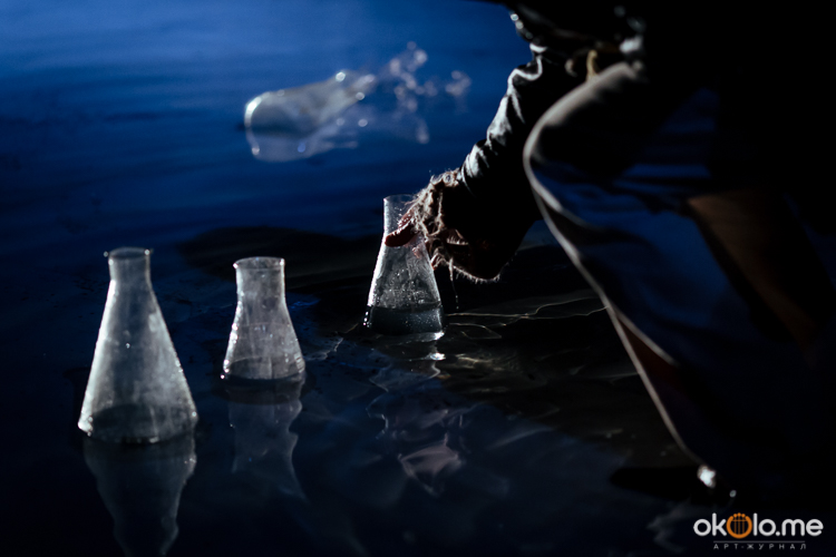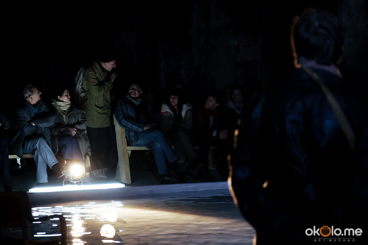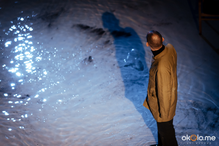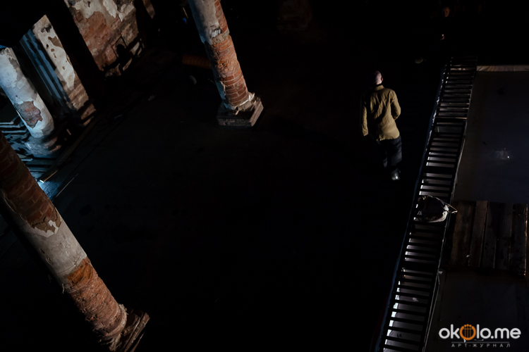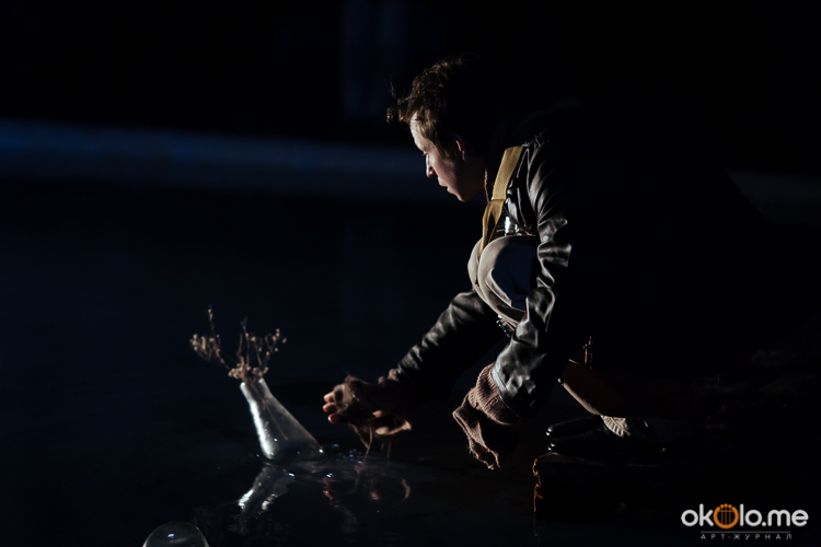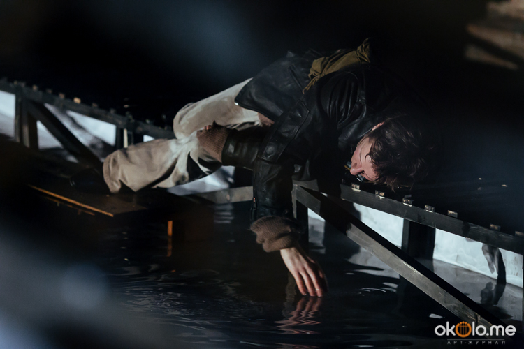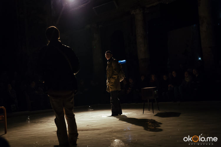 При входе на спектакль «Сталкеры» 12 марта зрителей напутствовали погрузиться в атмосферу. А обстановка, признаться, располагала. В центре зала, на полу, располагался резервуар с водой — а ведь вода имеет огромное значение в фильме Тарковского. Помните, как главный герой, Сталкер, всматривается в зеленоватую воду? Это медитация, это сосредоточенность на «здесь и сейчас». Замечательно, что спектакль происходил именно в Аннекирхе. Это особенное место, в котором пахнет сыростью и прошлым. Здесь когда-то молились Богу, потом смотрели фильмы, теперь показывают спектакль по мотивам великого кино.
