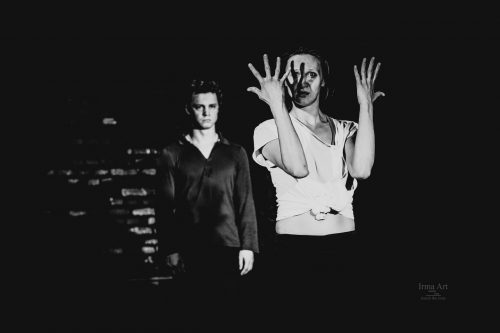 Само название «Ненормативная Пластика» уже готовит зрителей к тому, что слов будет как можно меньше, а своеобразной пластики, экспериментальной хореографии – как можно больше. Сначала был буквально баттл (что с английского переводится как бой, битва) «двух равных семейств мирных жителей», с агрессивными выпадами рассказчика, сидящего на цепи и прыгающего с криками время от времени на зрителя. А ближе к концу, когда уже Джульетту в белоснежном платье внесли в склеп, стояла гробовая тишина. Даже пришедший удрученный Ромео прощался с любимой тихо и аккуратно.