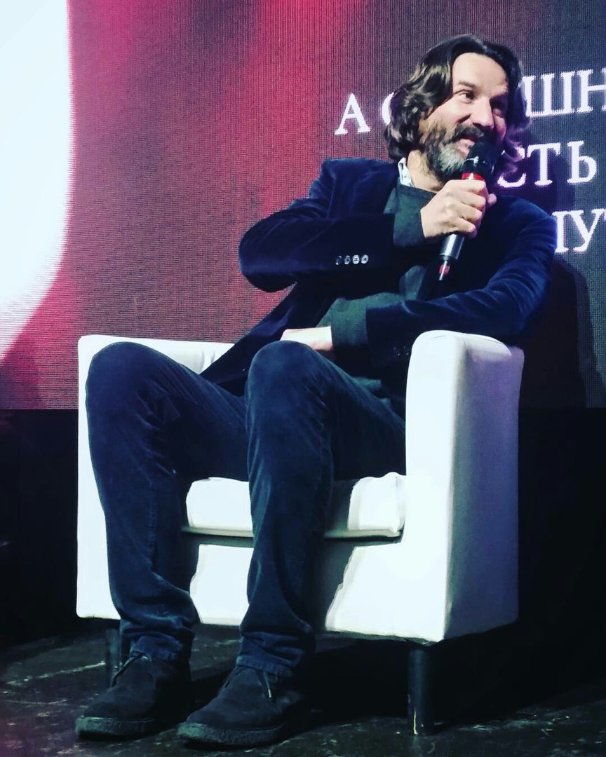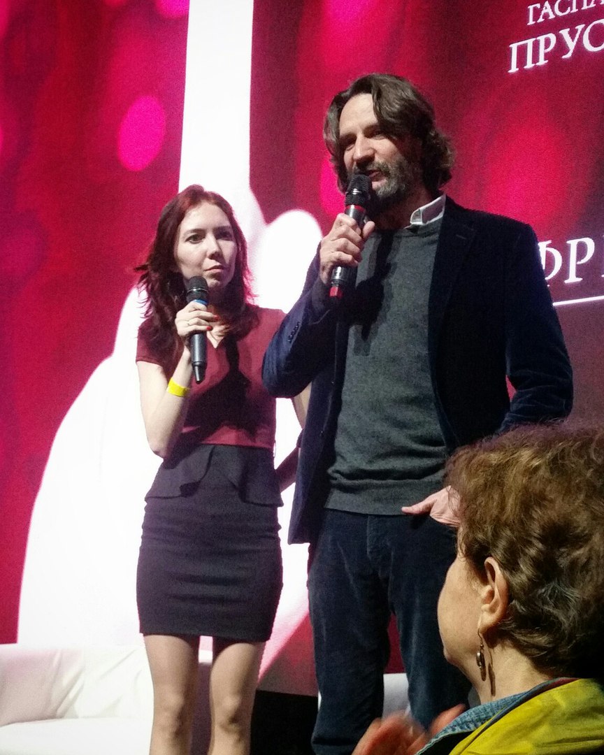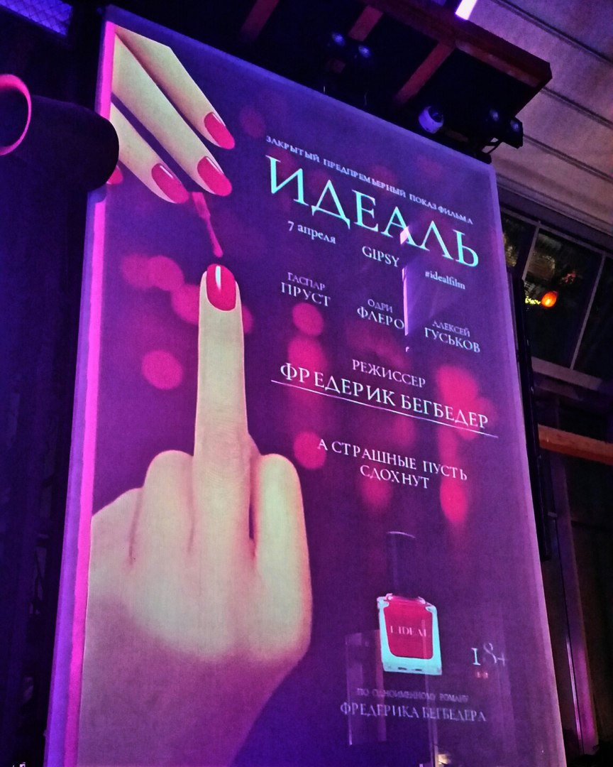 Итак, Фредерик выходит на так называемую сцену перед началом просмотра и на ломанном русском произносит: «Привет». Далее, естественно, он говорил по-французски: «Спасибо большое, что пришли. Показ моего фильма в России – очень волнительный для меня момент. Книгу я написал 10 лет назад, а теперь снял полнометражную кинокартину. Надеюсь, она вам понравится. Я буду рад, если за просмотром фильма, вы будете употреблять что-нибудь крепкое. В таком состоянии «Идеаль» лучше воспринимается».