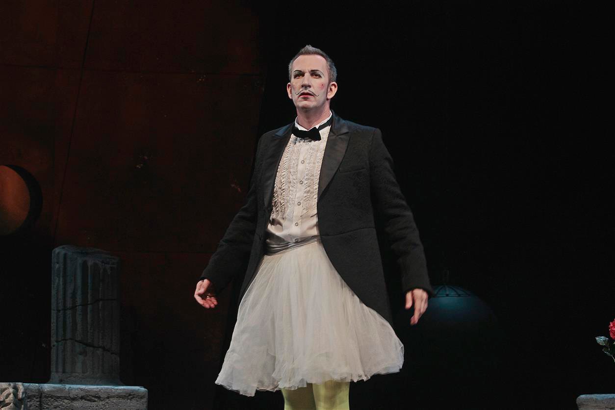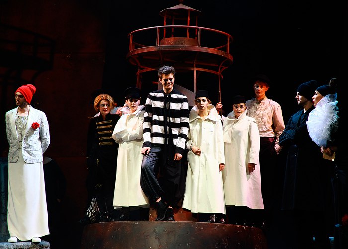 Цирковые мотивы пронизывают весь спектакль. Они проявляются и в костюмах некоторых героев, очень напоминающих клоунов, и в гриме, и в реквизите. Как вам тот факт, что вместо коня Сер Эндрю Эгчик (Сергей Колповский) ездит на огромном трехколесном велосипеде? Еще один забавный момент – розы-дротики, которые используются и как элемент ландшафта, и как игровая деталь. Финальное платье Виолы светится словно гирлянда, да и шляпка тоже напоминает цирковую.