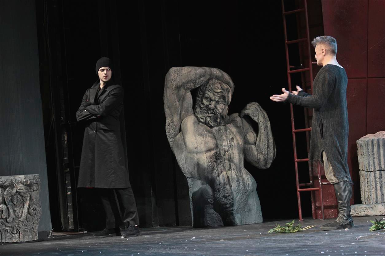 Удивили и декорации: части статуй древнегреческих атлетов, элементы колонн, капитель. Интересна также идея раздвигающегося центра сцены.
