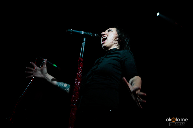 И в 20:40 белый занавес, которым была накрыта сцена, рухнул под песню «Громче и злей»! Песня начала звучать еще до того, как он опустился, и тени музыкантов на фоне занавеса придавали таинственность. Лу тепло поприветствовала поклонников в середине первой песни, а уже через несколько песен получила подарок от фан-клуба – яркие огни пиротехники озарили зал. Конечно, была не забыта традиция, соблюдаемая на каждом концерте — под песню «Словно Форрест Гамп» зал присел на некоторое время, а затем вновь поднялся и запел: «Беги, Форрест, беги!»