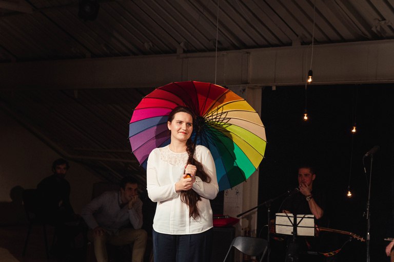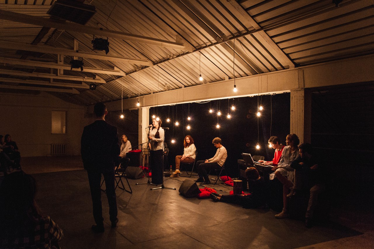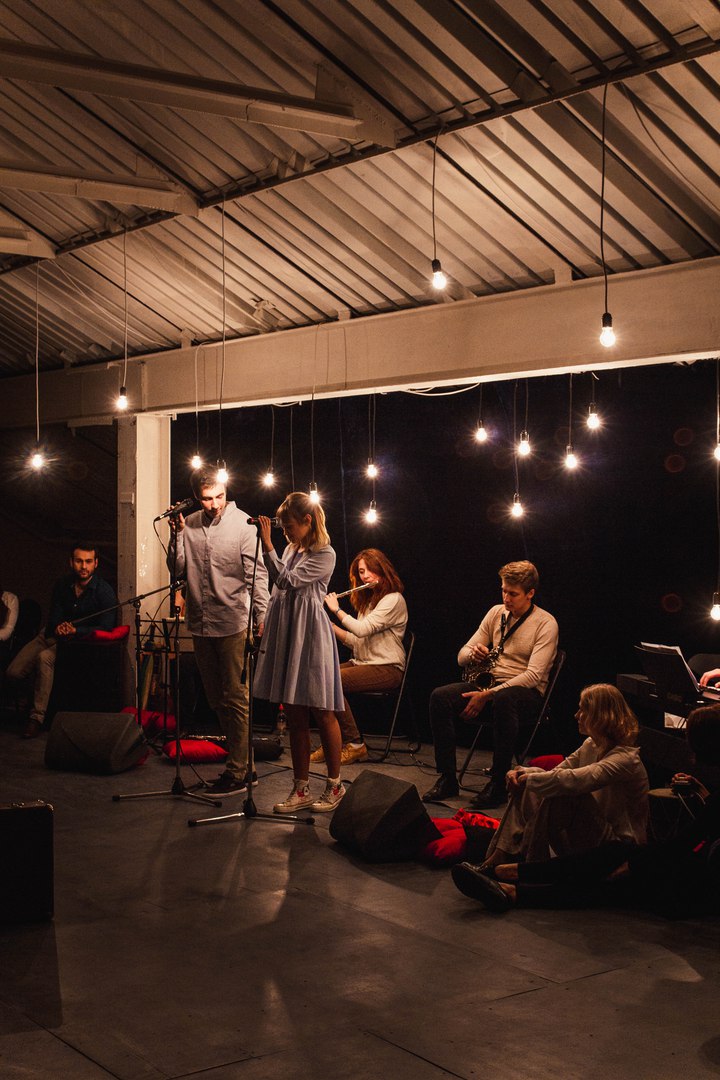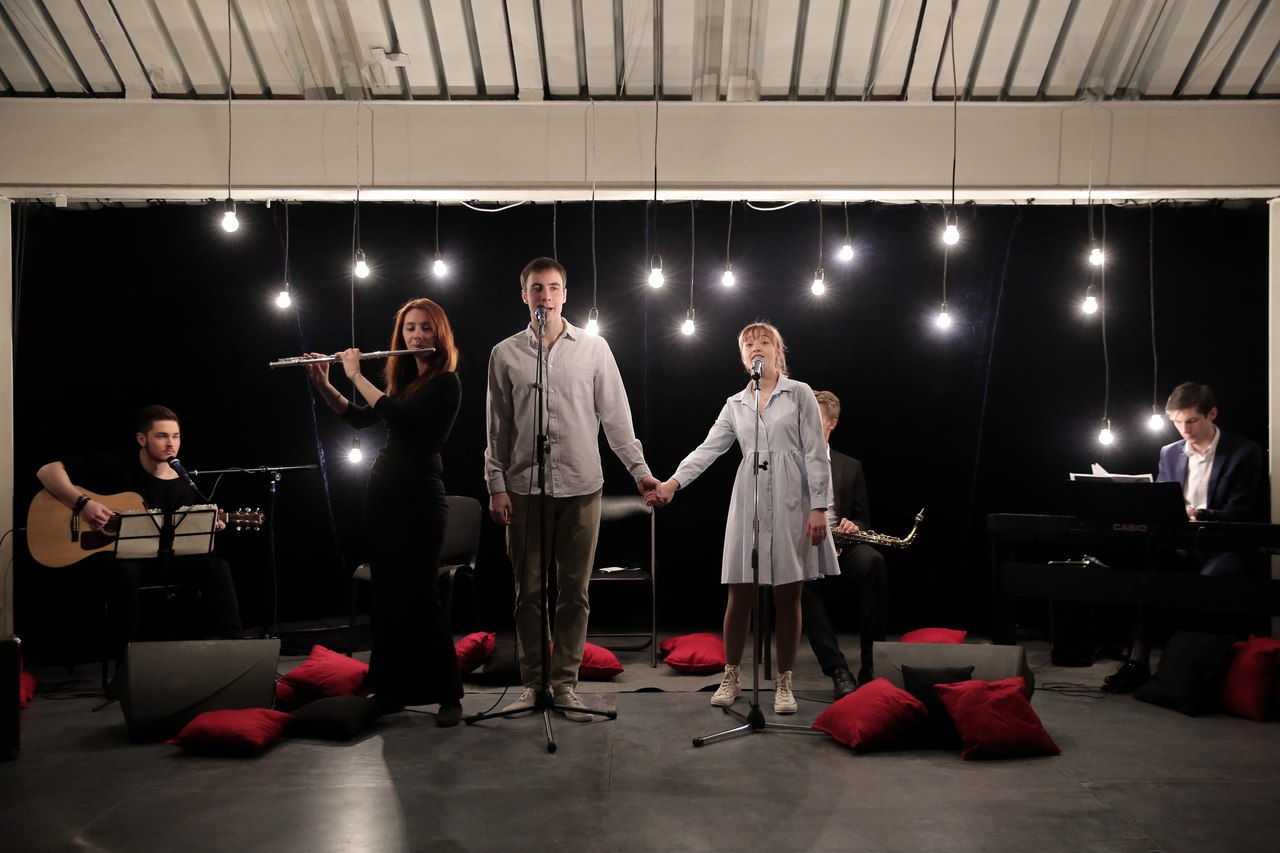 Поднимаемся на последний этаж, ведь нас, зрителей, пригласили на сцену с названием, говорящим само за себя – «Под крышей». Но на самом деле здесь нет сцены. Это мансарда с белыми и черными стенами, до безумия уютная и домашняя. Здесь царит полумрак, горят теплым светом лампочки над головами музыкантов (Александр Коркунов, Игорь Михалёв, Кристина Кристинина), у их ног раскиданы красные подушки, добавляющие атмосфере еще больше уюта, а зрители рассаживаются на места, какие выберут сами, совсем как в кругу друзей. Музыка стихает, зал замер в ожидании.