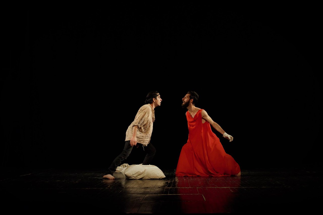 Главная особенность спектакля «Иона» в том, что он — пластический. Движения и пластика играют в нем важную роль. Прекрасные брутальные мужчины перемещаются по сцене в красных платьях — это красивое зрелище.