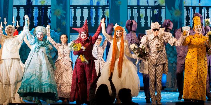 Забавны костюмы и грим артистов: они и сказочные, и цирковые, и повседневные. Очень веселили зрителей (особенно маленьких) головные уборы некоторых актеров, которые были в форме сердец, цилиндров и просто непонятных геометрических фигур. А золотой парик Золушки придавал героине особое очарование (говорят, что он весит больше 2 килограммов).