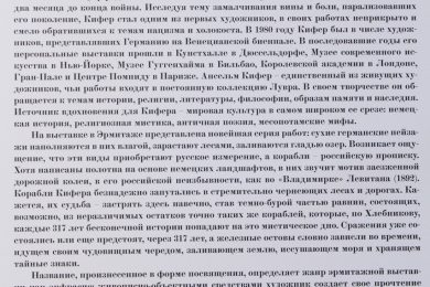 Нужно отметить, что некоторые картины немецкого художника ближе к скульптуре, чем к живописи в привычном ее понимании: он использует дерево, металл, скульптурные объекты. Работы Кифера, как и всякая серьезная живопись, требует длительного осмысленного рассматривания и внутреннего диалога с автором и его произведением.
