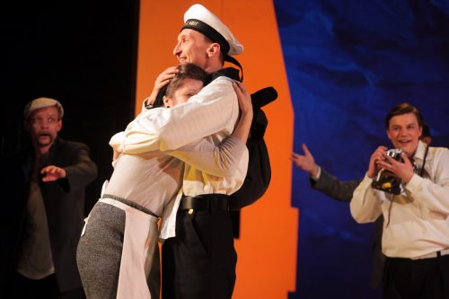 На сцене переплетаются сразу несколько историй: симпатия Светки комсомолки к фотографу Димке, постоянно следующего по всюду за ней по пятам и хочет сделать репортаж «Один день из жизни комсомолки», подруга Светки, Женька, ждёт со службы своего милого — Максима морячка, который уже давно ничего ей не писал.