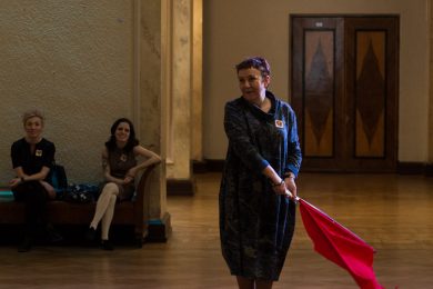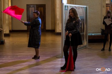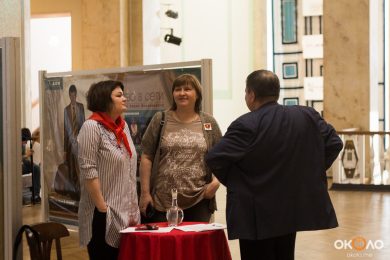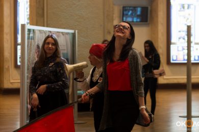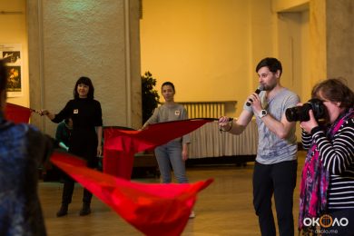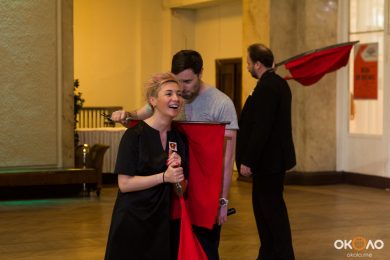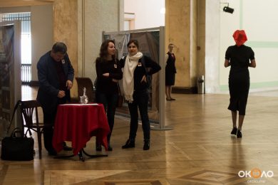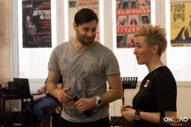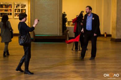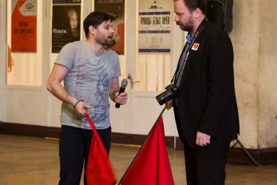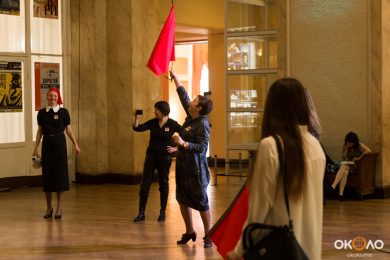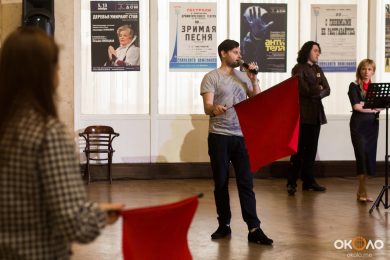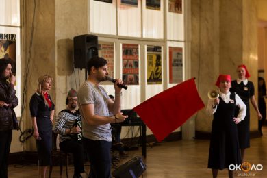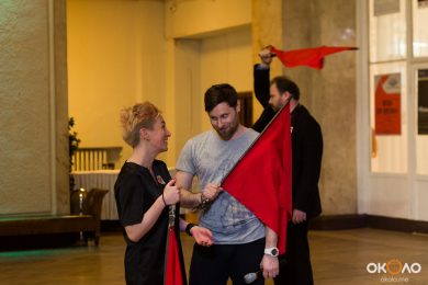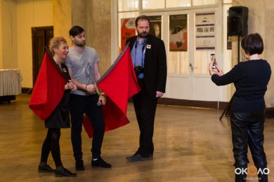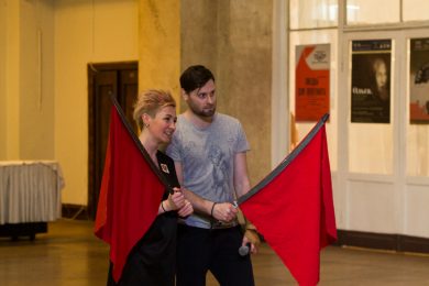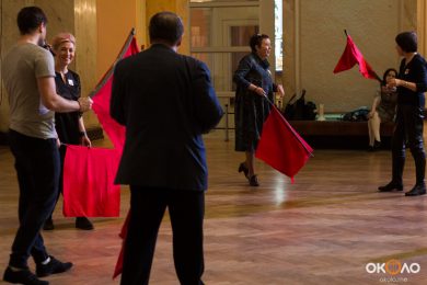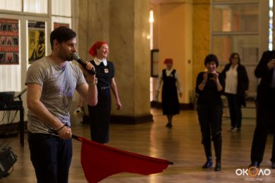 В фойе свистели шашки и развевались красные знамёна, дружинники в красных косынках подбадривали представителей прессы, чтобы те не стеснялись и присоединялись к мастер-классу по сценическому фехтованию, который провёл Роман Каганович — режиссер театра Ненормативной Пластики и постановщик движений в новом спектакле Анатолия Праудина по знаменитому роману «Как Закалялась Сталь«. Премьера спектакля намечена на 19-21 мая. Подробности и репортаж с пресс-конференции вскоре на нашем сайте!